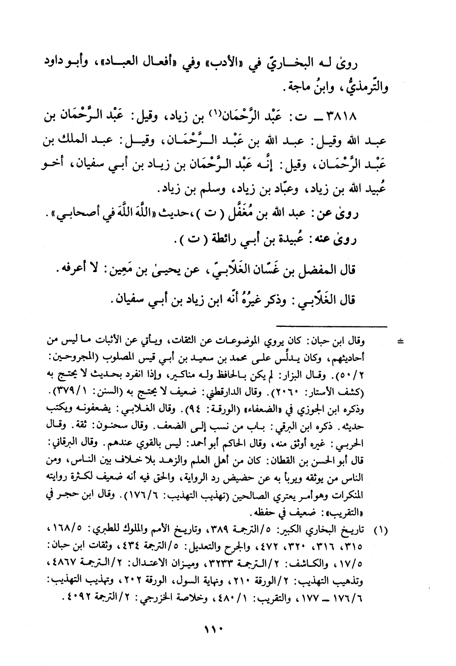 3818 - ت: عَبْد الرَّحْمَن بن زياد (1) ، وقيل: عَبْد الرَّحْمَن بْن عَبد اللَّه وقيل: عَبد اللَّهِ بْن عَبْد الرَّحْمَنِ، وقيل: عَبد المَلِك بْن عَبْد الرَّحْمَن، وقيل: أنه عَبْد الرَّحْمَن بْن زياد بْن أَبي سفيان، أَخُو عُبَيد اللَّه بْن زِيَاد، وعباد بْن زياد، وسلم بْن زياد.