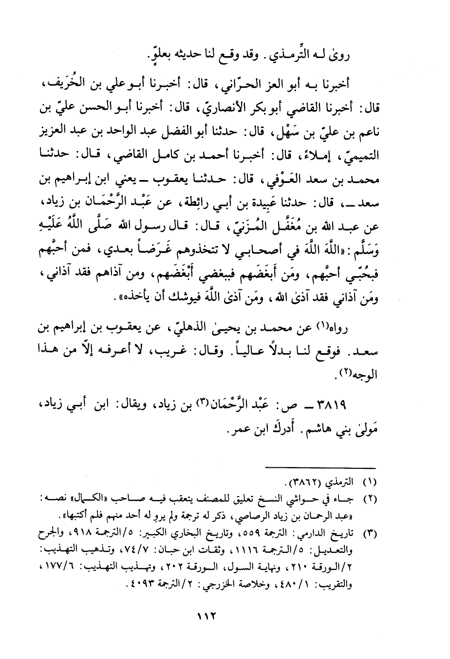 أخبرنا به أَبُو الْعِزِّ الْحَرَّانِيُّ، قال: أَخْبَرَنَا أَبُو عَلِيِّ بْنُ الْخَرِيفِ، قال: أَخْبَرَنَا الْقَاضِي أَبُو بكر الأَنْصارِيّ، قال: أَخْبَرَنَا أَبُو الْحَسَن علي بْنُ نَاعِمِ بْنِ عَلِيِّ بْنِ سَهْلٍ، قال: حَدَّثَنَا أَبُو الْفَضْلِ عَبْدُ الْوَاحِدِ بْنُ عَبْدِ الْعَزِيزِ التَّمِيمِيُّ، إِمْلاءً، قال: أَخْبَرَنَا أَحْمَدُ بْن كامل الْقَاضِي، قال: حَدَّثَنَا مُحَمَّدُ بْنُ سَعْدٍ الْعَوْفِيُّ، قال: حَدَّثَنَا يَعْقُوبُ، يَعْنِي ابْنَ إِبْرَاهِيمَ بْنِ سَعْدٍ، قال: حَدَّثَنَا عُبَيدة بْنُ أَبي رَائِطَةَ، عَنْ عَبْدِ الرَّحْمَن بْن زياد، عَنْ عَبد اللَّهِ بْنِ مُغَفَّلٍ الْمُزَنِيُّ، قال: قال رَسُولُ اللَّهِ صلى الله عَلَيْهِ وسَلَّمَ: اللَّهَ اللَّهَ فِي أَصْحَابِي لا تَتَّخِذُوهُمْ غَرَضًا بَعْدِي، فَمَنْ أَحَبَّهُمْ فَبِحُبِّي أَحَبَّهُمْ، ومَنْ أَبْغَضَهُمْ فَبِبُغْضِي أَبْغَضَهُمْ، ومَنْ آذَاهُمْ فَقَدْ آذَانِي، ومَنْ آذَانِي فَقَدْ آذَى اللَّهَ، ومَنْ آذَى اللَّهَ فَيُوشِكُ أَنْ يَأْخُذَهُ.
