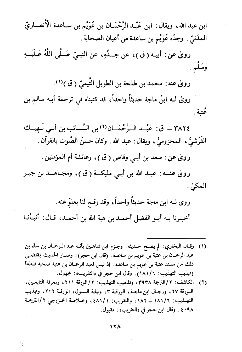 (1) وقَال البُخارِيُّ: لم يصح حديثه. وجزم ابن شاهين بأنه عَبْدُ الرَّحْمَنِ بْنُ سَالِمِ بْنِ عبد الرحمن بن عتبة بن عويم بن ساعدة. (قال ابن حجر) : وصار الحديث بمقتضى ذلك من مسند عتبة بن عويم بن ساعدة. إذ ليس لعبد الرحمن بن عتبة صحبة قطعا (تهذيب التهذيب: 6 / 181) . وَقَال ابن حجر في "التقريب": مجهول.