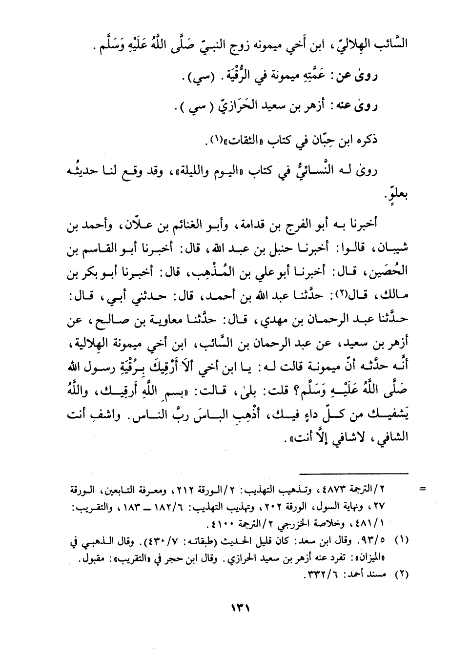 أخبرنا به أَبُو الْفَرَجِ بْنُ قُدَامَةَ، وأَبُو الغنائم بْن علان، وأحمد بْن شَيْبَانَ، قَالُوا: أَخْبَرَنَا حَنْبَلُ بْنُ عَبد اللَّهِ، قال: أخبرنا أَبُو القاسم بْن الحصين، قال: أَخْبَرَنَا أبو علي بْن المذهب، قال: أَخْبَرَنَا أبو بكر بْن مالك، قال (2) : حَدَّثَنَا عَبد اللَّهِ بْن أَحْمَدَ، قال: حَدَّثني أبي، قال: حَدَّثَنَا عَبْد الرحمن بْن مهدي، قال: حَدَّثَنَا مُعَاوِيَةُ بْنُ صَالِحٍ، عَنْ أَزْهَرَ بْنِ سَعِيد، عَنْ عَبْدِ الرَّحْمَنِ بْنِ السَّائِبِ، ابْن أخي مَيْمُونَةَ الْهِلالِيَّةِ، أَنَّهُ حَدَّثَهُ أَنَّ مَيْمُونَةَ قَالَتْ لَهُ: يَا ابْنَ أَخِي أَلا أُرَقِّيكَ بِرُقْيَةِ رَسُول اللَّهِ صلى الله عليه وسَلَّمَ؟ قُلْتُ: بَلَى، قَالَتْ: بِسْمِ اللَّهِ أَرْقِيكَ، واللَّهُ يَشْفِيكَ مِنْ كُلِّ دَاءٍ فِيكَ، اذْهِبِ الْبَاسَ رَبِّ النَّاسِ. واشْفِ أَنْتَ الشَّافِي، لا شافي إلا أنت.