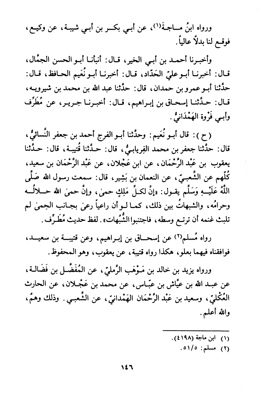 (ح) : قال أَبُو نُعَيْمٍ: وحَدَّثَنَا أَبُو الْفَرَجِ أَحْمَدُ بْنُ جَعْفَرٍ النَّسَائي، قال: حَدَّثَنَا جعفر بْن مُحَمَّد الفريابي، قال: حَدَّثَنَا قُتَيْبَةُ، قال: حَدَّثَنَا يَعْقُوبُ بْن عبد الرحمن، عن ابْن عَجْلانَ، عَنْ عَبْدِ الرَّحْمَنِ بْنِ سَعِيد، كُلِّهِمْ عَنِ الشَّعْبِيِّ، عَنِ النُّعْمَانِ بْنِ بَشِيرٍ، قال: سَمِعْتُ رَسُول اللَّهِ صلى الله عليه وسلم يَقُولُ: إِنَّ لِكُلِّ مَلِكٍ حِمَى، وأَنَّ حِمَى اللَّهِ حَلالُهُ وحَرَامُهُ، والشُّبُهَاتُ بَيْنَ ذَلِكَ، كَمَا لَوْ أَنَّ رَاعِيًا رَعَى بِجَانِبِ الْحِمَى لَمْ تَلْبَثْ غَنَمُهُ أَنْ تَرْتَعَ وسَطَهُ، فَاجْتَنِبُوا الشُّبُهَاتِ". لَفْظُ حَدِيثِ مُطَرِّفٍ.