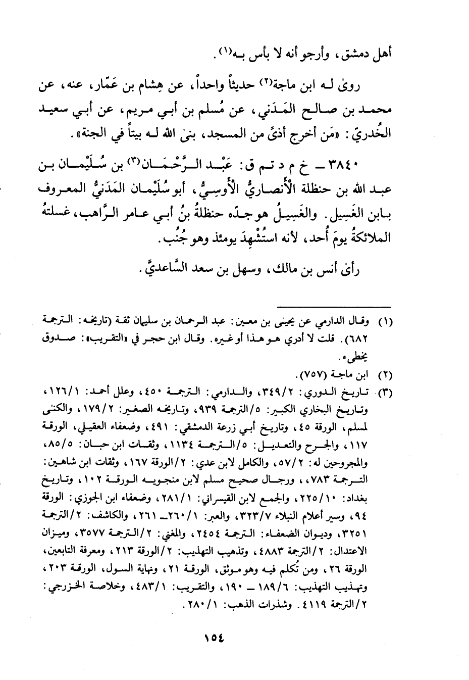 (1) وَقَال الدارمي عَن يحيى بْن مَعِين: عبد الرحمن بن سُلَيْمان ثقة (تاريخه: الترجمة 682) . قلت لا أدري هو هذا أو غيره. وَقَال ابن حجر في "التقريب": صدوق يخطئ.