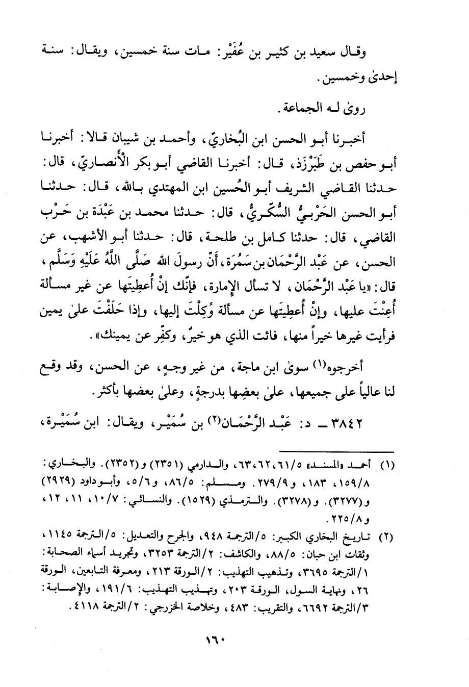 أَخْبَرَنَا أَبُو الْحَسَنِ بْنُ البخاري، وأحمد بْن شيبان قَالا: أخبرنا أبو حفص بن طبرزذ، قال: أخبرنا الْقَاضِي أَبُو بَكْرٍ الأَنْصارِيّ، قال: حَدَّثَنَا الْقَاضِي الشريف أَبُو الْحُسَيْنِ ابْنُ الْمُهَتِدِي بِاللَّهِ، قال: حَدَّثَنَا أَبُو الْحَسَنِ الْحَرْبِيُّ السكري، قال: حَدَّثَنَا مُحَمَّد بْن عَبْدَةَ بْنِ حَرْبٍ الْقَاضِي، قال: حَدَّثَنَا كَامِلُ بْنُ طَلْحَةَ، قال: حَدَّثَنَا أَبُو الأَشْهَبِ، عَنِ الْحَسَنِ، عَنْ عَبْد الرحمن بْن سَمُرَة، أن رَسُول اللَّهِ صَلَّى اللَّهُ عَلَيْهِ وسَلَّمَ، قال: يَا عَبْدَ الرَّحْمَنِ، لا تَسْأَلِ الإِمَارَةَ، فَإِنَّكَ إِنْ أُعْطِيتَهَا عَنْ غَيْرِ مَسْأَلَةٍ أُعِنْتَ عَلَيْهَا، وإِنْ أُعْطِيتَهَا عَنْ مَسْأَلَةٍ وكِلْتَ إِلَيْهَا، وإِذَا حَلَفْتَ عَلَى يَمِينٍ فَرَأَيْتَ غَيْرَهَا خَيْرًا مِنْهَا، فَائْتِ الَّذِي هُوَ خَيْرٌ، وكَفِّرْ عَنْ يَمِينِكَ.