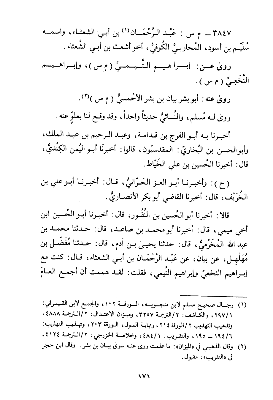 3847 - م س: عَبْد الرَّحْمَنِ بن أَبي الشعثاء (1) ، واسمه سليم بْن أسود، المحاربي الكوفي، أخو أشعث بْن أَبي الشعثاء.