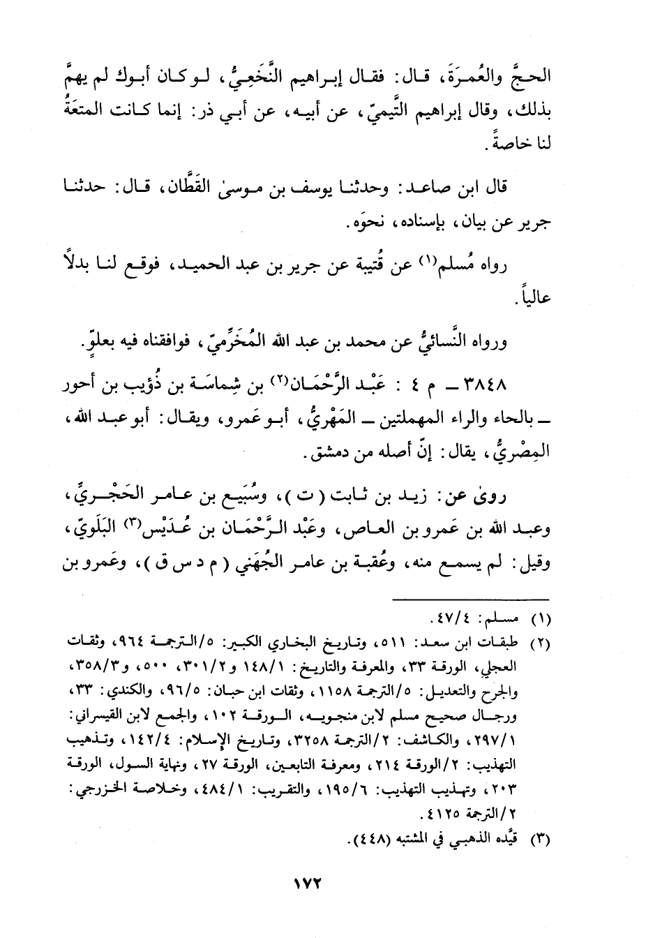 الحج والعُمَرة، قال: فقال إبراهيم النخعي، لو كان أبوك لم يهم بذلك، وَقَال إبراهيم التَّيْمِيّ، عَن أَبِيهِ، عَن أَبِي ذَرٍّ: إنما كانت المتعة لنا خاصة.