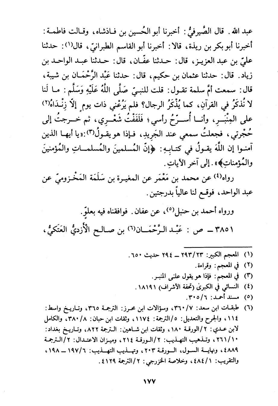 عَبد اللَّهِ. قال الصَّيْرَفِيُّ: أَخْبَرَنَا أَبُو الْحُسَيْنِ بْنُ فَاذشَاهِ، وَقَالت فَاطِمَةُ: أخبرنا أَبُو بَكْرِ بْنُ رِيذَةَ، قَالا: أخبرنا أَبُو الْقَاسِمِ الطَّبَرَانِيّ، قال (1) : حَدَّثَنَا علي بْن عَبْدِ الْعَزِيزِ، قال: حَدَّثَنَا عَفَّانُ، قال: حَدَّثَنَا عَبْدُ الْوَاحِدِ بْنُ زِيَاد. قال: حَدَّثَنَا عُثْمَان بْن حَكِيمٍ، قال: حَدَّثَنَا عَبْدُ الرَّحْمَنِ بْنُ شَيْبَة، قال: سَمِعْتُ أُمَّ سَلَمَةَ تَقُولُ: قُلْتُ لِلنَّبِيِّ صَلَّى اللَّهُ عَلَيْهِ وسَلَّمَ: مَا لَنَا لانذكر فِي الْقُرْآنِ، كَمَا يَذْكُرُ الرِّجَالِ؟ فَلَمْ يَرُعْنِي ذَاتَ يَوْمٍ إِلا زِنْدَاهُ (2) عَلَى الْمِنْبَرِ، وأَنَا أُسَرِّحُ رَأْسِي ; فَلَفَفْتُ شَعْرِي، ثُمَّ خَرَجْتُ إِلَى حُجْرَتِي، فَجَعَلْتُ سَمْعِي عِنْدَ الْجَرِيدِ، فَإِذَا هُوَ يَقُولُ (3) : يَا أَيُّهَا الَّذِينَ آمَنُوا إِنَّ اللَّهَ يَقُولُ فِي كِتَابِهِ: {إِنَّ الْمُسْلِمِينَ والْمُسْلِمَاتِ والْمُؤْمِنِينَ والْمُؤْمِنَاتِ} ". إِلَى آخِرِ الآيَاتِ.