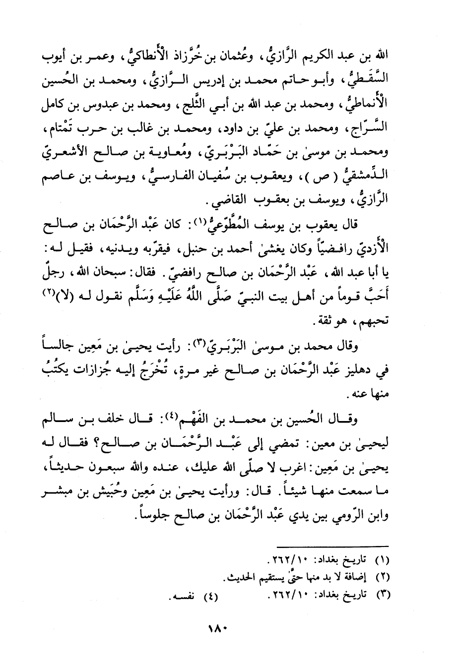 وَقَال مُحَمَّد بْن موسى البربري (3) : رأيت يحيى بْن مَعِين جالسا فِي دهليز عَبْد الرَّحْمَن بْن صالح غير مرة، تخرج إليه جزازات يكتب منها عنه.