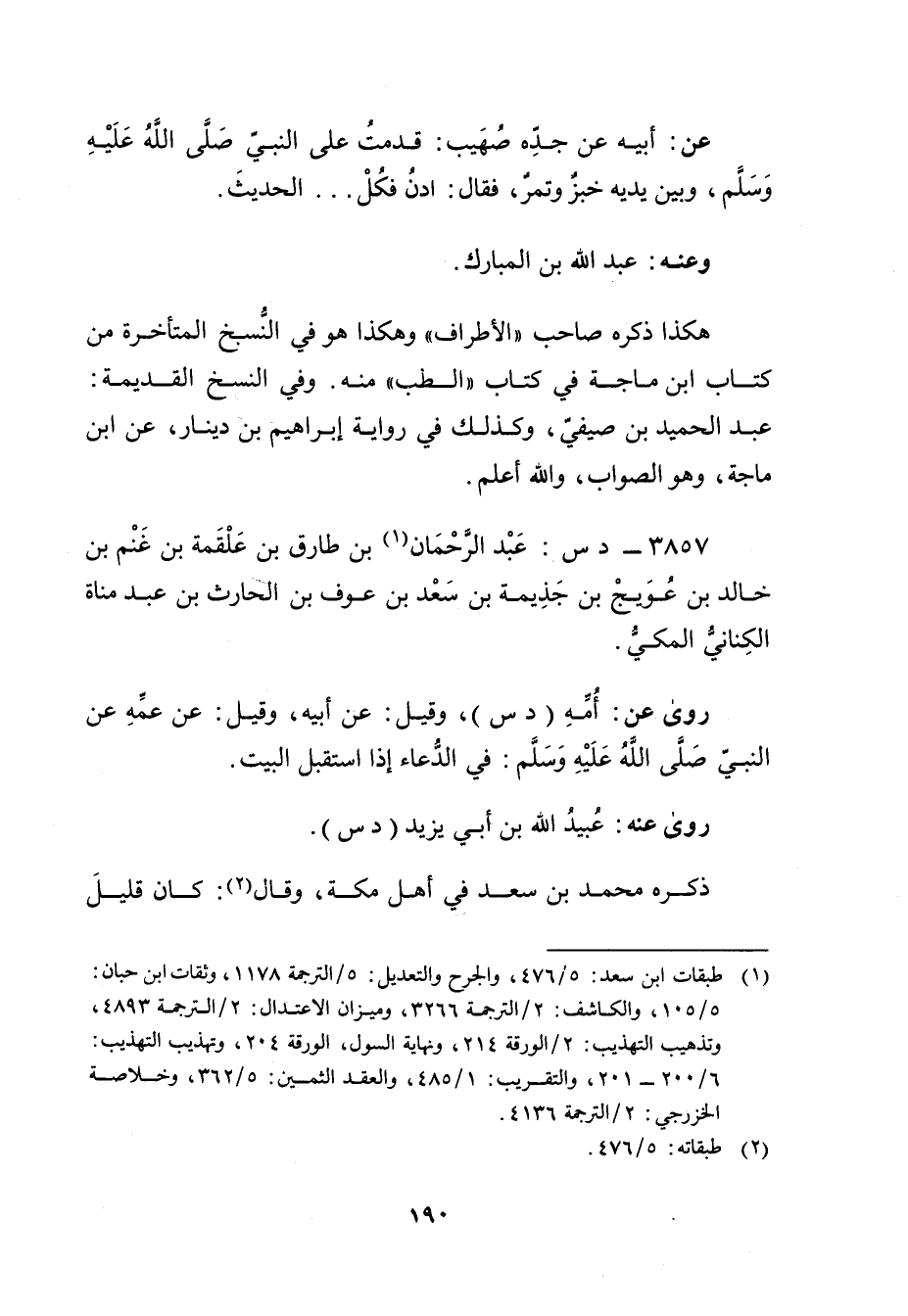 3857 - د س: عَبْد الرَّحْمَنِ بن طارق بن علقمة بن غنم بن خالد بن عويج بن جذيمة بن سعد بن عوف بن الحارث بن عبد مناة الكناني المكي (1) .