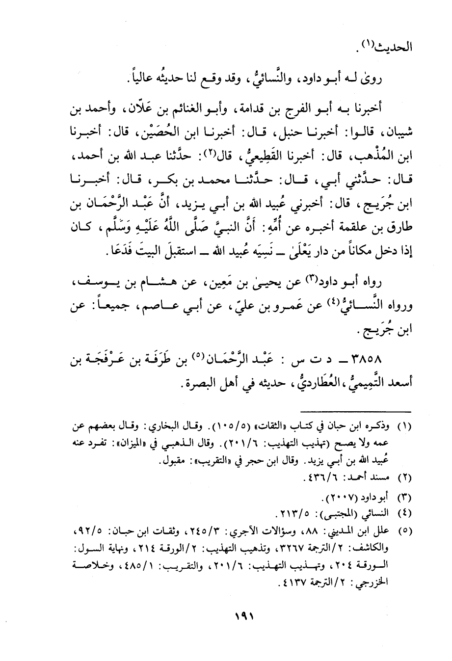 3858 - د ت س: عَبْد الرَّحْمَن بن طرفة بن عرفجة بن أسعد التميمي (5) ، العطاردي، حديثه في أهل البصرة.