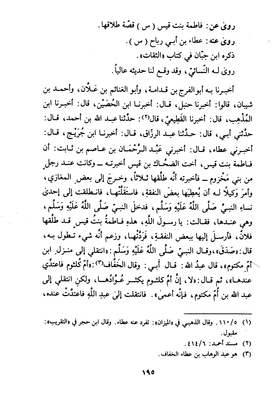أَخْبَرَنَا بِهِ أَبُو الْفَرَجِ بْنُ قُدَامَةَ، وأبو الغنائم بْن علان، وأحمد بْنُ شَيْبَانَ، قَالُوا: أَخْبَرَنَا حَنْبَلُ، قال: أخبرنا ابن الحصين، قال: أخبرنا ابْنُ الْمُذْهِب، قال: أخبرنا القَطِيعِيّ، قال (2) : حَدَّثَنَا عَبد الله بْن أَحْمَدَ، قال: حَدَّثني أبي، قال: حَدَّثَنَا عَبْدُ الرَّزَّاقِ، قال: أَخْبَرَنَا ابْنُ جُرَيْج، قال: أَخْبَرَنِي عَطَاءٌ، قال: أَخْبَرَنِي عَبْدُ الرَّحْمَنِ بْنُ عَاصِمِ بْنِ ثَابِتٍ: أَنَّ فَاطِمَةَ بِنْتِ قَيْسٍ، أُخْتُ الضَّحَّاكِ بْنِ قَيْسٍ أَخْبَرَتْهُ - وكَانَتْ عِنْدَ رَجُلٍ مِنْ بَنِي مَخْزُومٍ - فَأَخْبَرَتْهُ أَنَّهُ طَلَّقَهَا ثَلاثًا، وخَرَجَ إِلَى بَعْضِ الْمَغَازِي، وأَمَرَ وكِيلا لَهُ أَنْ يُعْطِيهَا بَعْضَ النَّفَقَةِ، فَاسْتَقَلَّتْهَا، فانطلق إِلَى إِحْدَى نِسَاءِ النَّبِيِّ صَلَّى اللَّهُ عَلَيْهِ وسَلَّمَ، فَدَخَلَ النَّبِيُّ صَلَّى اللَّهُ عَلَيْهِ وسَلَّمَ، وهي عِنْدَهَا، فَقَالَتْ: يَا رَسُولَ اللَّهِ، هَذِهِ فَاطِمَةُ بِنْتُ قَيْسٍ قَدْ طَلَّقَهَا فُلانٌ، فَأَرْسَلَ إِلَيْهَا بِبَعْضِ النَّفَقَةِ، فَرَدَّتْهَا، وزَعَمَ أَنَّهُ شَيْءٌ تَطُولُ بِهِ، قال: صَدَقَ"، وَقَال النَّبِيُّ صلى الله عليه وسلم: انْتَقِلِي إِلَى مَنْزِلِ ابْنِ أُمِّ مَكْتُومٍ"، قال عَبد اللَّهِ: قال أَبِي: وَقَال الْخَفَّافُ (3) : أُمِّ كُلْثُومٍ فَاعْتَدِّي عِنْدَهَا"ثُمَّ قال: لا، إِنَّ أُمَّ كُلْثُومٍ يَكْثُرُ عُوَّادُهَا، ولَكِنِ انْتَقِلِي إِلَى عَبد اللَّهِ بن أُمِّ مَكْتُومٍ، فَإِنَّهُ أَعْمَى". فَانْتَقَلَتْ إِلَى عَبد اللَّهِ فَاعْتَدَّتْ عِنْدَهُ،