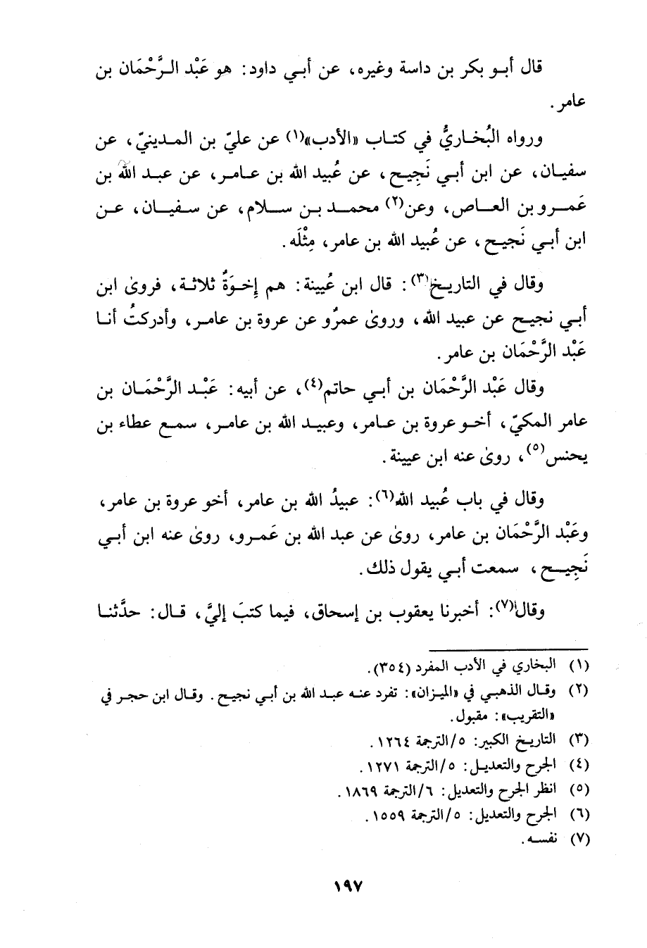 ورواه البخاري في كتاب"الأدب" (1) عَنْ علي بْن المديني، عَن سفيان، عن ابْنِ أَبي نَجِيحٍ، عن عُبَيد اللَّه بْن عامر، عَنْ عَبد اللَّهِ بْن عَمْرو بْن العاص، وعن (2) مُحَمَّد بْن سلام، عَنْ سفيان، عَنِ ابن أَبي نجيح، عَنْ عُبَيد اللَّه بْن عامر، مثله.