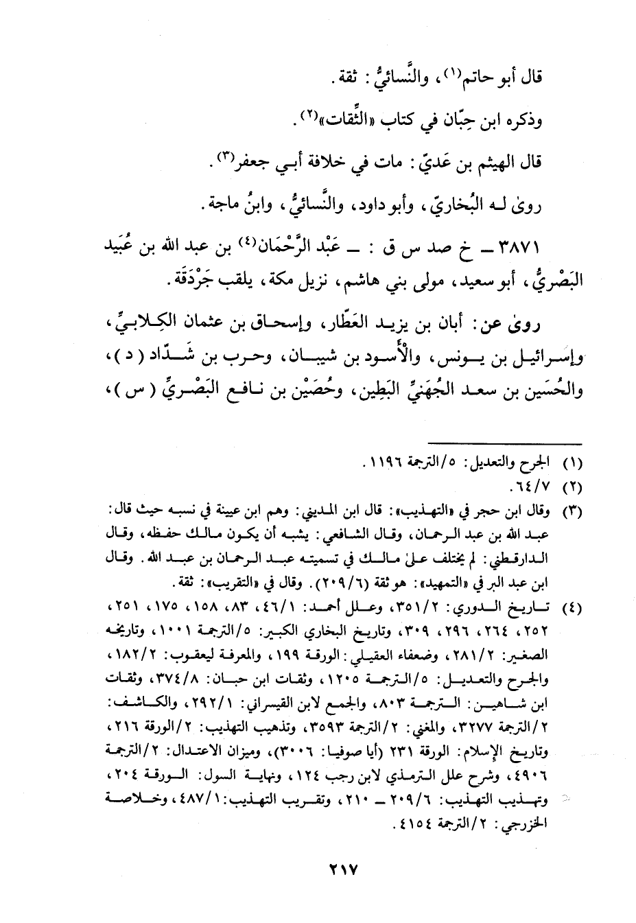 3871 - خ صد س ق: - عَبْد الرَّحْمَن بن عَبد اللَّه بن عُبَيد البَصْرِيّ (4) ، أَبُو سَعِيد، مولى بني هاشم، نزيل مكة، يلقب جردقة.
