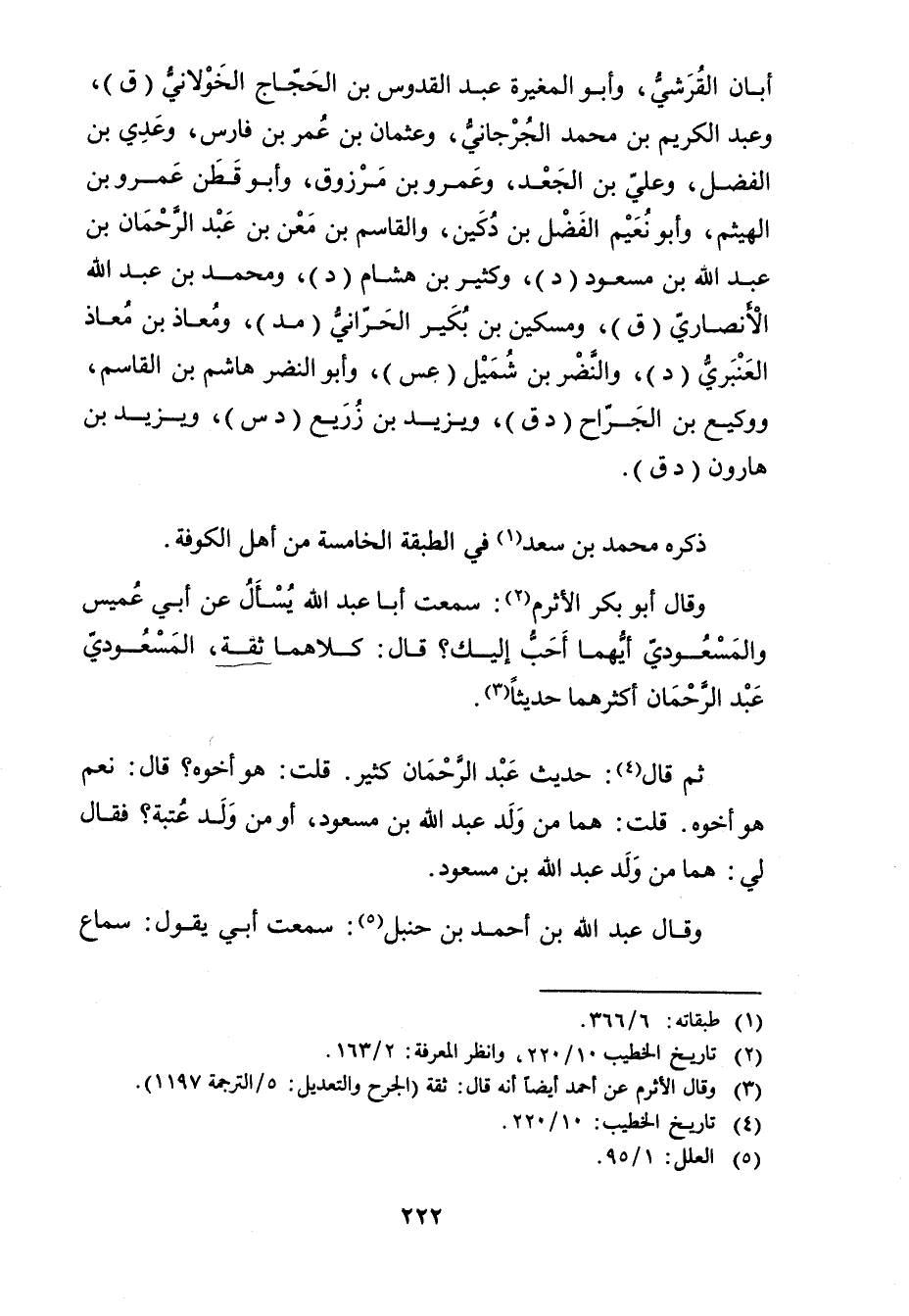 ثم قال (4) : حديث عَبْد الرَّحْمَن كثير. قلت: هو أخوه؟ قال: نعم هو أخوه. قلت: هما من ولد عَبد اللَّه بْن مسعود، أو من ولد عتبة؟ فقال لي: هما من ولد عَبد اللَّه بْن مسعود.