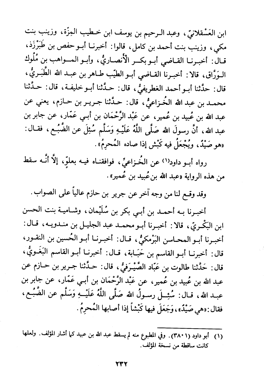 ابن الْعَسْقَلانِيِّ، وعَبْدُ الرَّحِيمِ بْنُ يُوسُفَ ابن خَطِيبِ الْمِزَّةِ، وزَيْنَبُ بِنْتُ مَكِّيٍّ، وزينب بنت أَحْمَد بْن كامل، قَالُوا: أَخْبَرَنَا أَبُو حفص بْن طبرزذ، قال: أخبرنا الْقَاضِي أَبُو بَكْرٍ الأَنْصارِيّ، وأَبُو الْمَوَاهِبِ بْنُ مُلُوكٍ الْوَرَّاقُ، قالا: أَخْبَرَنَا الْقَاضِي أَبُو الطَّيِّبِ طَاهِرُ بْنُ عَبد اللَّهِ الطَّبَرِيُّ، قال: حَدَّثَنَا أَبُو أَحْمَدَ الْغِطْرِيفِيُّ، قال: حَدَّثَنَا أَبُو خَلِيفَةَ، قال: حَدَّثَنَا مُحَمَّدُ بْنُ عَبد اللَّهِ الْخُزَاعِيُّ، قال: حَدَّثَنَا جَرِيرُ بْنُ حَازِمٍ، يَعْنِي عَنْ عَبد اللَّهِ بْن عُبَيد بْن عُمَير، عَن عَبْد الرحمن بْن أَبي عَمَّارٍ، عَنْ جَابِرِ بْنِ عَبد اللَّهِ، أن رَسُول اللَّه صَلَّى اللَّهُ عليه وسلم سُئِلَ عَنِ الضَّبُعِ، فَقَالَ: هُوَ صَيْدٌ، ويُجْعَلُ فِيهِ كَبْشٌ إِذَا صَادَهُ الْمُحْرِمُ.