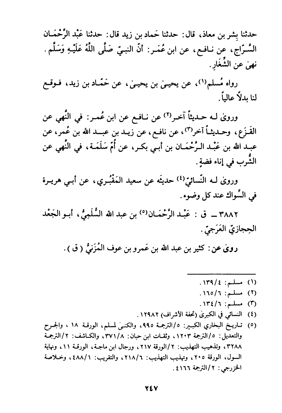 (5) تاريخ البخاري الكبير: 5 / الترجمة 995، والكنى لمسلم، الورقة 18، والجرح والتعديل: 5 / الترجمة 1203، وثقات ابن حبان: 8 / 371، والكاشف: 2 / الترجمة 3288، وتذهيب التهذيب: 2 / الورقة 217، ورجال ابن ماجة، الورقة 11، ونهاية السول، الورقة 205، وتهذيب التهذيب: 6 / 218، والتقريب: 1 / 488، وخلاصة الخزرجي: 2 / الترجمة 4166.