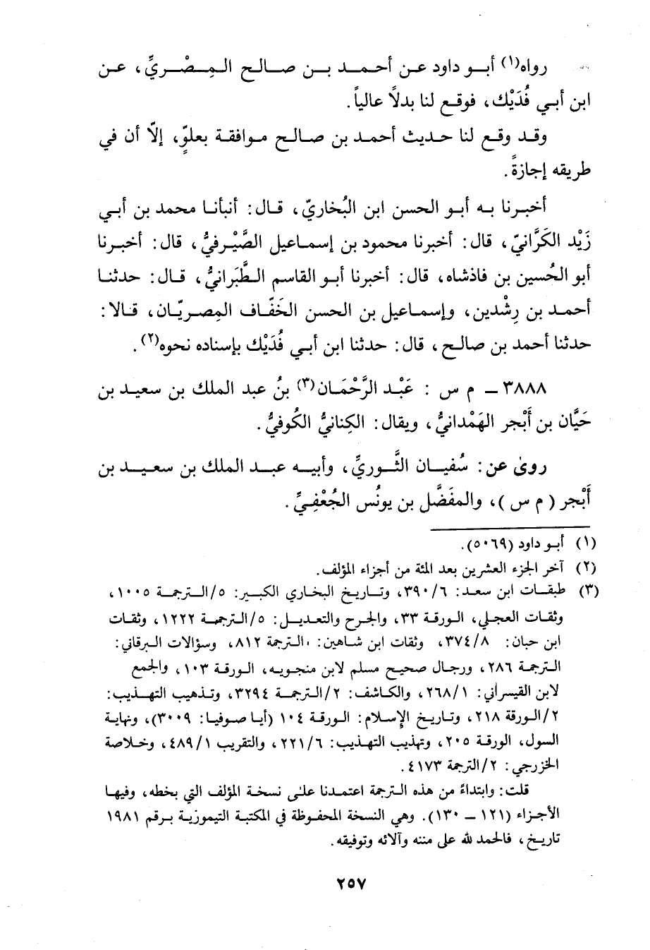 (3) طبقات ابن سعد: 6 / 390، وتاريخ البخاري الكبير: 5 / الترجمة 1005، وثقات العجلي، الورقة 33، والجرح والتعديل: 5 / الترجمة 1222، وثقات ابن حبان: 8 / 374، وثقات ابن شاهين: الترجمة 812، وسؤالات البرقاني: الترجمة 286، ورجال صحيح مسلم لابن منجويه، الورقة 103، والجمع لابن القيسراني: 1 / 268، والكاشف: 2 / الترجمة 3294، وتذهيب التهذيب: 2 / الورقة 218، وتاريخ الاسلام: الورقة 104 (أيا صوفيا: 3009) ، ونهاية السول، الورقة 205، وتهذيب التهذيب: 6 / 221، والتقريب 1 / 489، وخلاصة الخزرجي: 2 / الترجمة 4173. قلت: وابتداء من هذه الترجمة اعتمدنا على نسخة المؤلف التي بخطه، وفيها الاجزاء (121 - 130) . وهي النسخة المحفوظة في المكتبة التيمورية برقم 1981 تاريخ، فالحمد لله على مننه وآلائه وتوفيقه.
