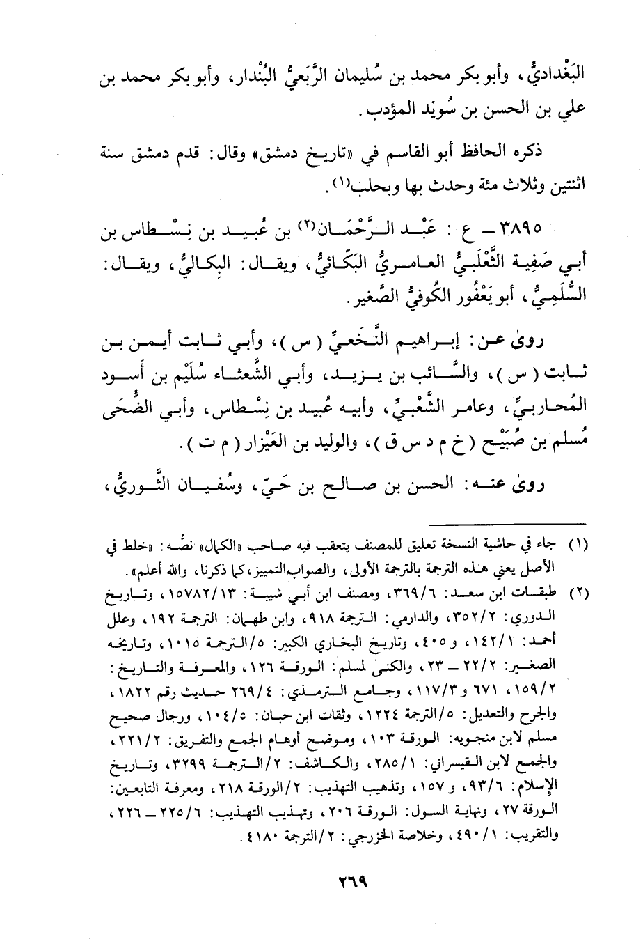 3895 - ع: عَبْد الرحمن بْن عُبَيد بْن نسطاس بن أَبي صفية الثعلبي العامري البكائي (2) ، ويُقال: البكالي، ويُقال: السلمي، أَبُو يعفور الكوفي الصغير.