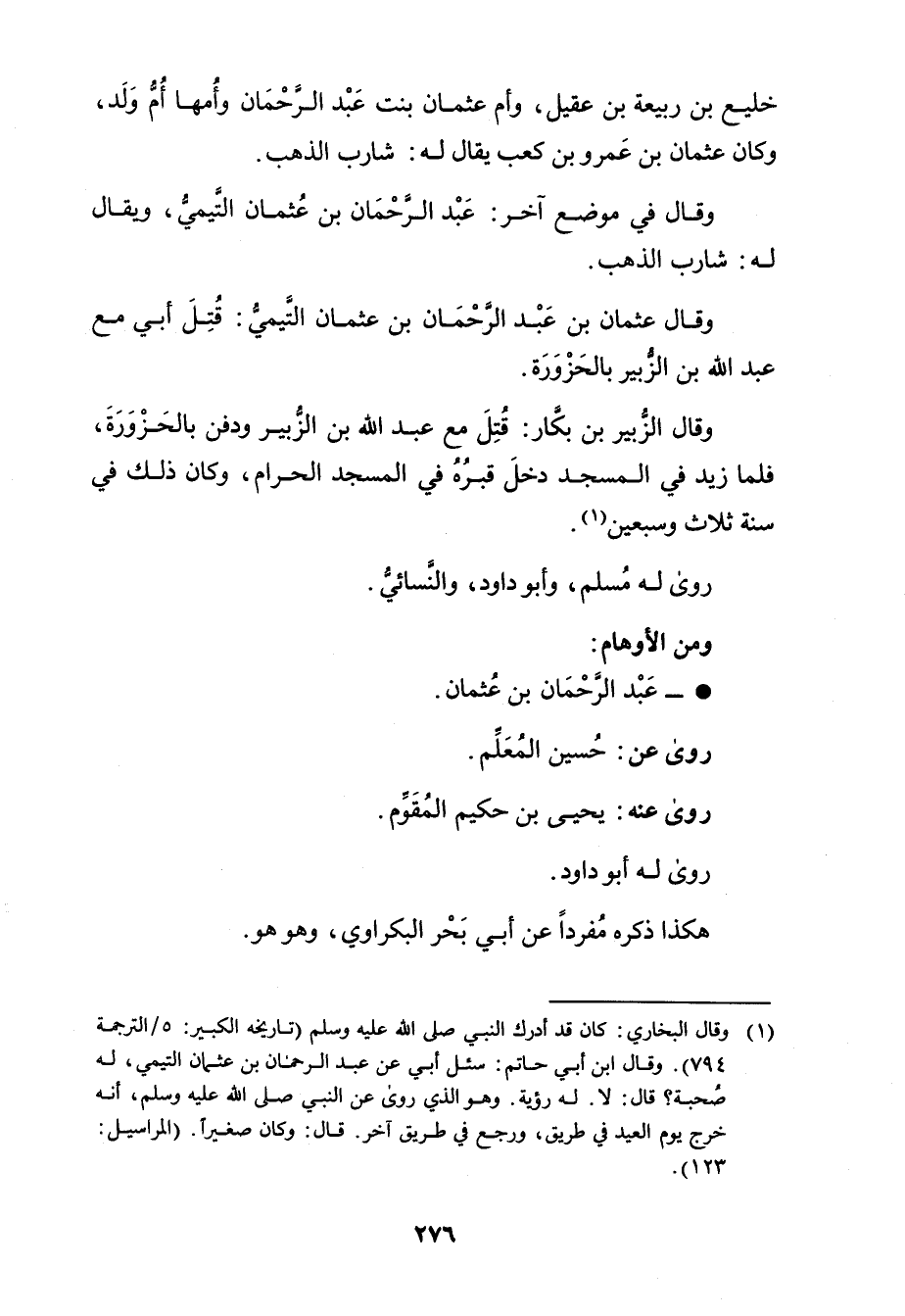 (1) وقَال البُخارِيُّ: كان قد أدرك النَّبِيّ صَلَّى اللَّهُ عليه وسلم (تاريخه الكبير: 5 / الترجمة 794) . وَقَال ابن أَبي حاتم: سئل أَبِي عَنْ عَبْدِ الرَّحْمَنِ بْنِ عثمان التَّيْمِيّ، لهُ صُحبَةٌ؟ قال: لا. له رؤية. وهو الذي رَوى عنِ النَّبِي صلى الله عليه وسلم، أنه خَرَجَ يَوْمَ الْعِيدِ فِي طَرِيقٍ، ورجع في طريق آخر. قال: وكان صغيرا. (المراسيل: 123) .