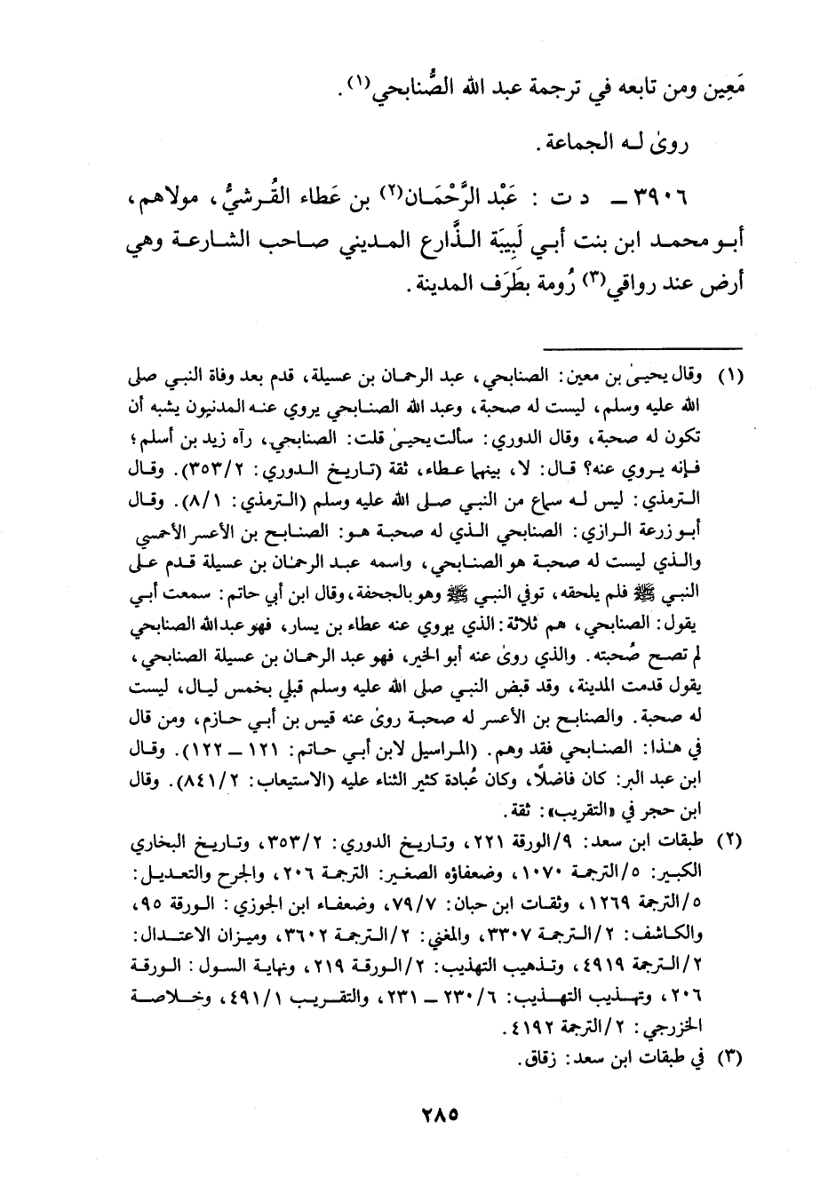 (1) وَقَال يحيى بن مَعِين: الصنابحي: عبد الرحمن بن عسيلة، قدم بَعْدَ وفَاةِ النَّبِيِّ صَلَّى اللَّهُ عليه وسلم، ليست لهُ صُحبَةٌ، وعبد الله الصنابحي يروي عنه المدنيون يشبه أن تكون لهُ صُحبَةٌ، وَقَال الدوري: سألت يحيى قلت: الصنابحي، رآه زيد بن أسلم، فإنه يروي عنه؟ قال: لا، بينهما عطاء، ثقة (تاريخ الدوري: 2 / 353) . وَقَال التِّرْمِذِيّ: ليس له سماع من النبي صلى الله عليه وسلم (التِّرْمِذِيّ: 1 / 8) . وَقَال أبو زُرْعَة الرازي: الصنابحي الذي لهُ صُحبَةٌ هو: الصنابح بن الاعسر الاحمسي والذي ليست لهُ صُحبَةٌ هو الصنابحي، واسمه عبد الرحمن بن عسيلة قدم على النبي صلى الله عليه وسلم فلم يلحقه، توفي النبي صلى الله عليه وسلم وهو بالجحفة، وَقَال ابن أَبي حاتم: سمعت أبي يقول: الصنابحي، هم ثلاثة: الذي يروي عنه عطاء بن يسار، فهو عَبد الله الصنابحي لم تصح صحبته. والذي روى عنه أبو الخير، فهو عبد الرحمن بن عسيلة الصنابحي، يقول: قدمت المدينة، وقد قبض النبي صلى الله عليه وسلم قبلي بخمس ليال، ليست له صحبة. والصنابح بن الاعسر لهُ صُحبَةٌ روى عنه قيس بن أَبي حازم، ومن قال في هذا: الصنابحي فقد وهم. (المراسيل لابن أَبي حاتم: 121 - 122) . وَقَال ابن عَبد الْبَرِّ: كان فاضلا، وكان عبادة كثير الثناء عليه (الاستيعاب: 2 / 841) . وَقَال ابن حجر في "التقريب": ثقة.
