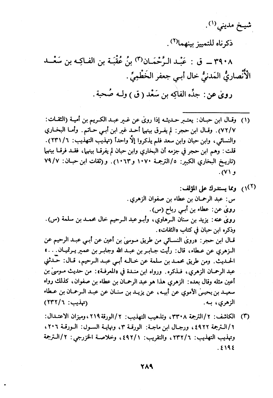 3908 - ق: عَبْد الرَّحْمَن بن عقبة بن الفاكه بن سعد الأَنْصارِيّ المدني خال أَبِي جَعْفَر الخطمي (3) .