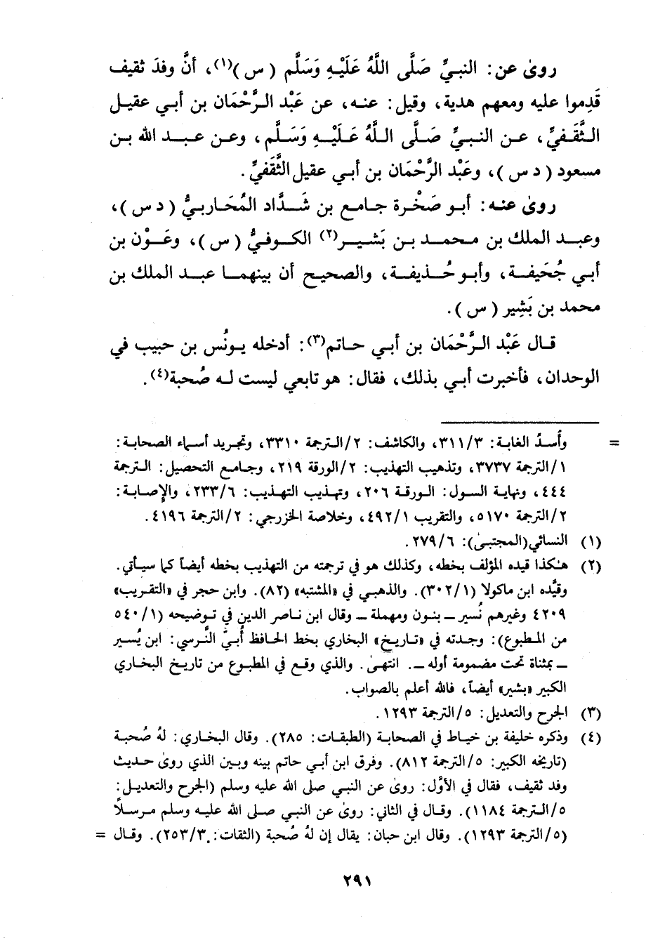 (4) وذكره خليفة بن خياط في الصحابة (الطبقات: 285) . وقَال البُخارِيُّ: لهُ صُحبَةٌ (تاريخه الكبير: 5 / الترجمة 812) . وفرق ابن أَبي حاتم بينه وبين الذي روى حديث وفد ثقيف، فقال في الأول: رَوى عنِ النَّبِي صلى الله عليه وسلم (الجرح والتعديل: 5 / الترجمة 1184) . وَقَال في الثاني: رَوى عنِ النَّبِي صلى الله عليه وسلم مُرْسلاً (5 / الترجمة 1293) . وَقَال ابن حبان: يقال إن لهُ صُحبَةٌ (الثقات: 3 / 253) . وَقَال =