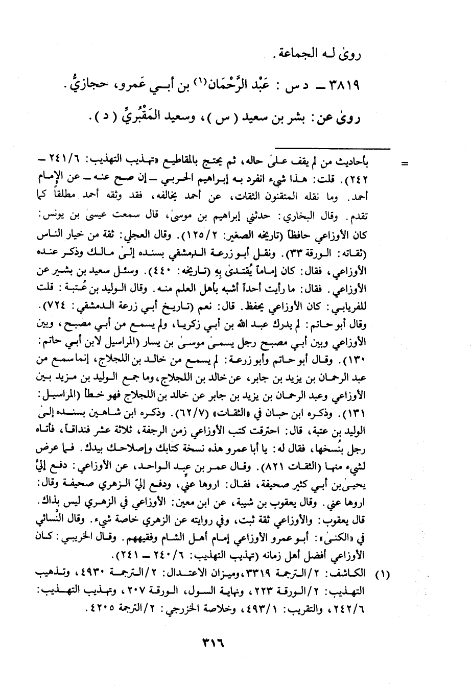 (1) الكاشف: 2 / الترجمة 3319، وميزان الاعتدال: 2 / الترجمة 4930، وتذهيب التهذيب: 2 / الورقة 223، ونهاية السول، الورقة 207، وتهذيب التهذيب: 6 / 242، والتقريب: 1 / 493، وخلاصة الخزرجي: 2 / الترجمة 4205.