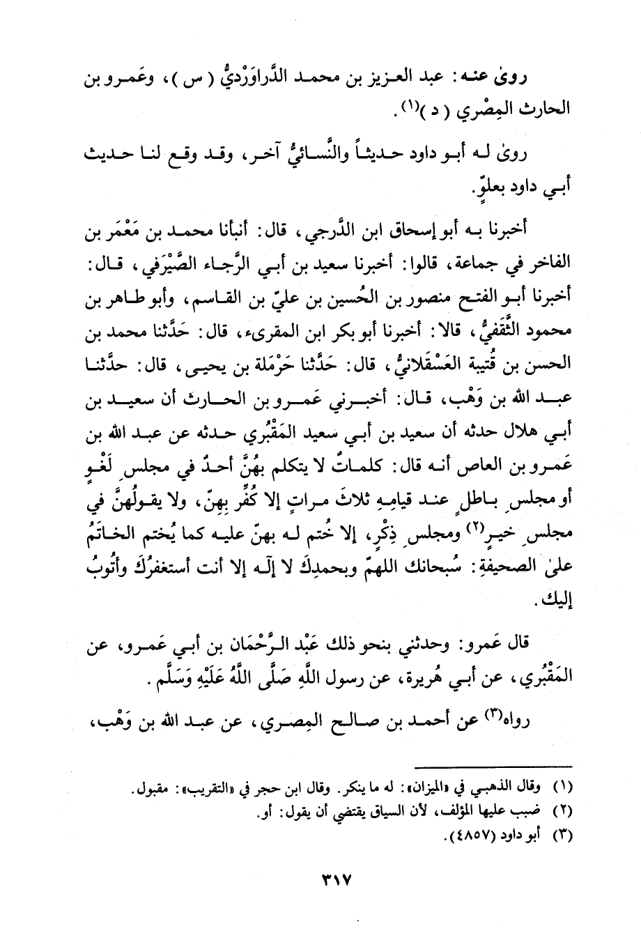 أخبرنا بِهِ أَبُو إِسْحَاقَ ابْنُ الدَّرَجِيِّ، قال: أَنْبَأَنَا مُحَمَّدُ بْنُ مَعْمَرِ بْنِ الْفَاخِرِ فِي جَمَاعَةٍ، قَالُوا: أَخْبَرَنَا سَعِيد بْنُ أَبي الرَّجَاءِ الصَّيْرَفِيُّ، قال: أخبرنا أَبُو الْفَتْحِ مَنْصُورُ بْن الحسين بْن علي بْن الْقَاسِمِ، وأَبُو طَاهِرِ بْنُ مَحْمُودٍ الثَّقَفِيُّ، قَالا: أخبرنا أَبُو بَكْرِ بْنُ الْمُقْرِئِ، قال: حَدَّثَنَا مُحَمَّدُ بْن الحسن بْن قتيبة العسقلاني، قال: حَدَّثَنَا حَرْمَلَةُ بْنُ يَحْيَى، قال: حَدَّثَنَا عَبد اللَّهِ بْن وهب، قال: أَخْبَرَنِي عَمْرو بْن الْحَارِثِ أَنَّ سَعِيد بْنَ أَبي هِلالٍ حَدَّثَهُ أَنَّ سَعِيد بْنَ أَبي سَعِيد الْمَقْبُرِيَّ حَدَّثَهُ عَنْ عَبد اللَّهِ بْن عَمْرو بْن الْعَاصِ أَنَّهُ قال: كَلِمَاتٌ لا يَتَكَلَّمُ بِهِنَّ أَحَدٌ فِي مَجْلِسِ لَغْوٍ أَوْ مَجْلِسِ بَاطِلٍ عِنْدَ قِيَامِهِ ثَلاثَ مَرَّاتٍ إِلا كُفِّرَ بِهِنَّ، ولا يَقُولُهُنَّ فِي مَجْلِسِ خَيْرٍ (2) ومَجْلِسِ ذِكْرٍ، إِلا خُتِمَ لَهُ بِهِنَّ عَلَيْهِ كَمَا يَخْتِمُ الْخَاتَمُ عَلَى الصَّحِيفَةِ: سُبْحَانَكَ اللَّهُمَّ وبِحَمْدِكَ لا إِلَهَ إِلا أَنْتَ أَسْتَغْفِرُكَ وأَتُوبُ إِلَيْكَ.