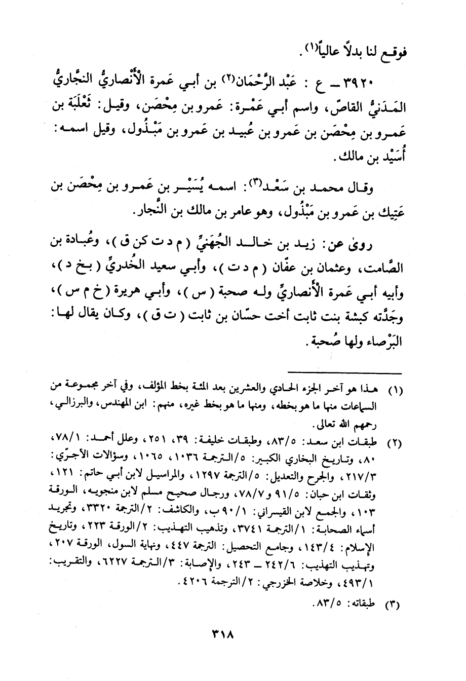 3920 - ع: عَبْد الرَّحْمَن بن أَبي عَمْرة الأَنْصارِيّ النجاري المدني القاص (2) ، واسم أَبِي عَمْرة: عَمْرو بْن محصن، وقيل: ثعلبة بْن عَمْرو بْن محصن بْن عَمْرو بْن عُبَيد بْن عَمْرو بْن مبذول، وقيل اسمه: أسيد بْن مالك.