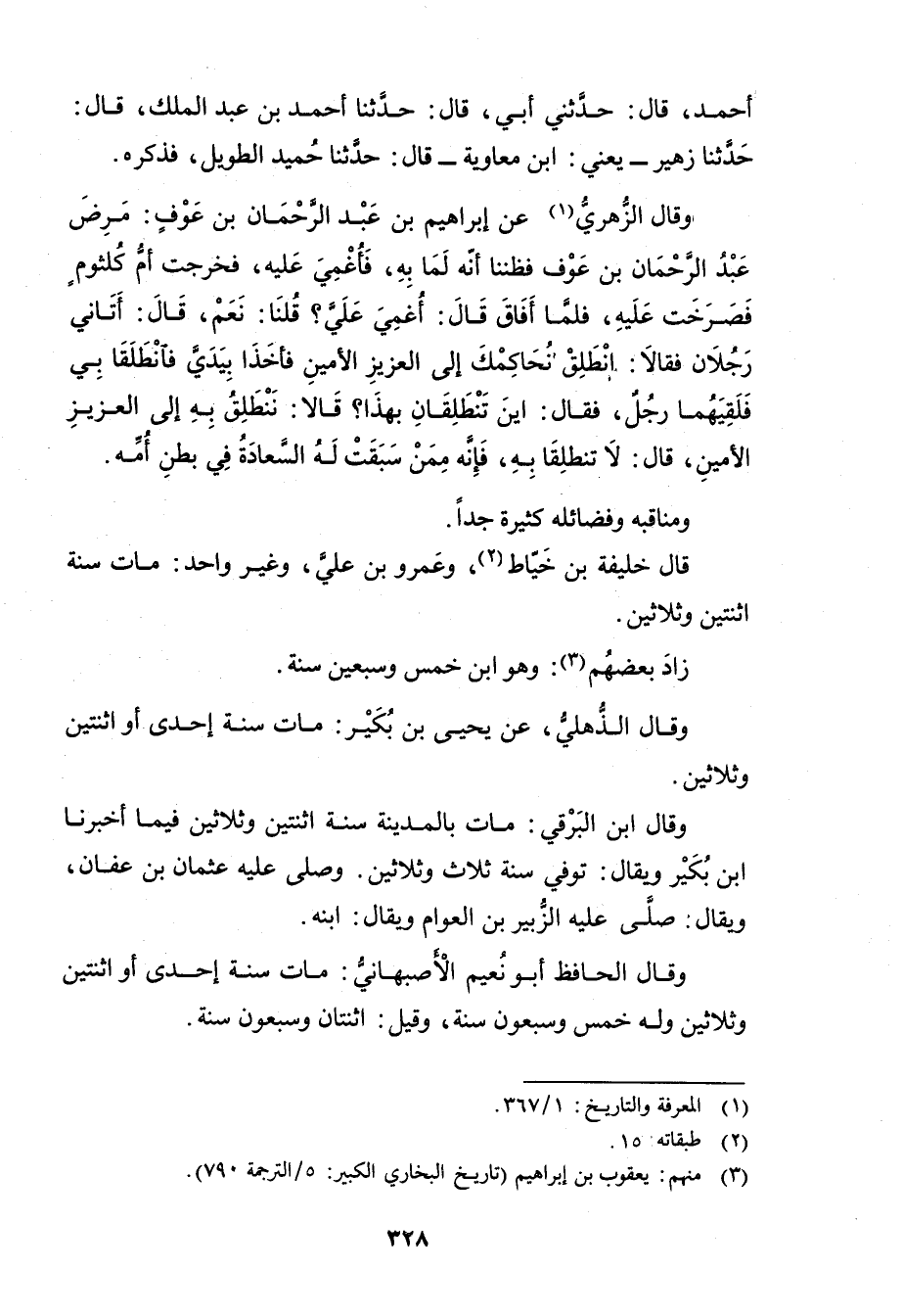 وَقَال الزُّهْرِيّ (1) عَنْ إبراهيم بْن عَبْد الرَّحْمَنِ بْن عوف: مرض عَبْد الرَّحْمَن بْن عوف فظننا أنه لما بِهِ، فأغمي عليه، فخرجت أم كلثوم فصرخت عليه، فلما أفاق قال: أغمي علي؟ قلنا: نعم، قال: أتاني رجلان فقالا: انطلق نحاكمك إلى العزيز الأمين فأخذا بيدي فانطلقا بي فلقيهما رجل، فقال: أين تنطلقان بهذا؟ قالا: ننطلق بِهِ إلى العزيز الأمين، قال: لا تنطلقا بِهِ، فإنه ممن سبقت له السعادة فِي بطن أمه.