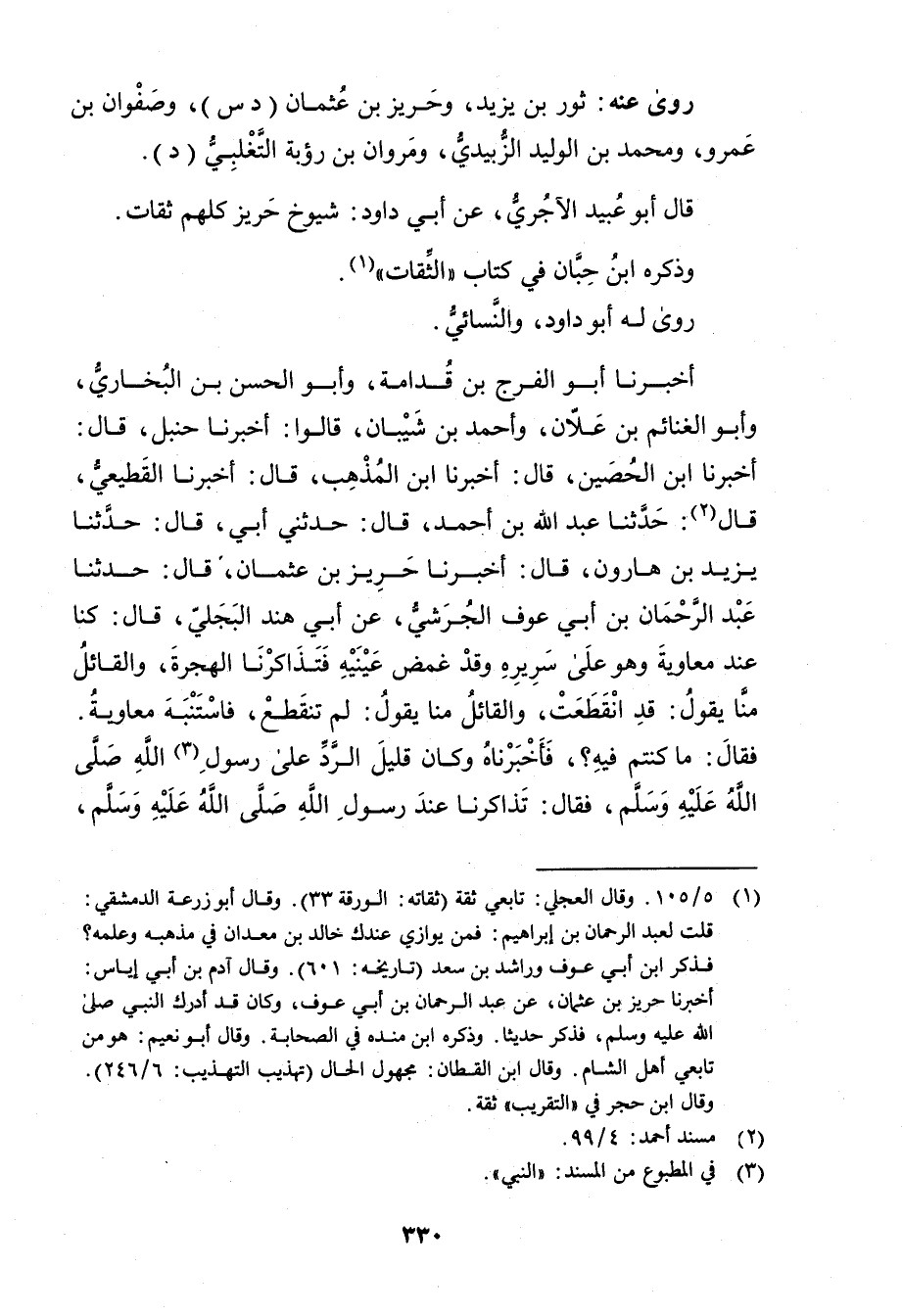 أَخْبَرَنَا أَبُو الْفَرَجِ بْنِ قُدَامَةَ، وأَبُو الْحَسَنِ بْنُ الْبُخَارِيِّ، وأَبُو الْغَنَائِمِ بْنُ عَلانَ، وأَحْمَدُ بْنُ شَيْبَانَ، قَالُوا: أَخْبَرَنَا حنبل، قال: أخبرنا ابن الحصين، قال: أخبرنا ابْنُ الْمُذْهِب، قال: أخبرنا القَطِيعِيّ، قال (2) : حَدَّثَنَا عَبد اللَّهِ بْن أَحْمَدَ، قال: حَدَّثني أَبِي، قال: حَدَّثَنَا يَزِيدُ بْنُ هَارُونَ، قال: أَخْبَرَنَا حَرِيزُ بْنُ عُثْمَانَ، قال: حَدَّثَنَا عَبْدُ الرَّحْمَنِ بْنِ أَبي عَوْفٍ الْجُرَشِيِّ، عَن أَبِي هِنْدٍ الْبَجْلِيِّ، قال: كُنَّا عِنْدَ مُعَاوِيَةَ وهُوَ عَلَى سَرِيرِهِ وقَدْ غَمَّضَ عَيْنَيْهِ فَتَذَاكَرْنَا الْهِجْرَةَ، والْقَائِلُ مِنَّا يَقُولُ: قَدِ انْقَطَعَتْ، والْقَائِلُ مِنَّا يَقُولُ: لَمْ تَنْقَطِعْ، فَاسْتَنْبَهَ مُعَاوِيَةُ. فَقَالَ: مَا كُنْتُمْ فِيهِ؟ ، فَأَخْبَرَنَاهُ وكَانَ قَلِيلُ الرَّدِّ على رَسُول (3) اللَّهِ صلى الله عَلَيْهِ وسَلَّمَ، فَقَالَ: تَذَاكَرْنَا عِنْدَ رَسُول اللَّهِ صلى الله عليه وسلم،