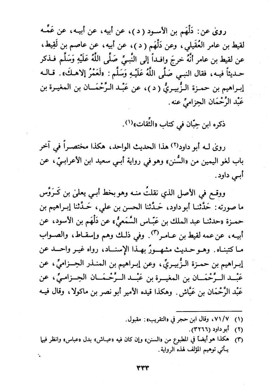 ووقع فِي الأصل الذي نقلت منه وهو بخط أَبِي يَعْلَى بْن كروس ما صورته: حَدَّثَنَا أَبُو داود، حَدَّثَنَا الحسن بْن علي، حَدَّثَنَا إبراهيم بْن حمزة"حَدَّثَنَا عَبد المَلِك بْن عباس السمعي"عن دلهم بن الأسود، عَن أبيه، عَنْ عمه لقيط بْن عامر (3) . وفي ذلك وهم وإسقاط، والصواب ما كتبناه. وهو حديث مشهور بهذا الإسناد، رواه غير واحد عَنْ إبراهيم بْن حمزة الزبيري، وعن إبراهيم بْن المنذر الحزامي، عَنْ عَبْد الرَّحْمَن بْن المغيرة بْن عَبْد الرحمن الحزامى، عَنْ عَبْد الرَّحْمَن بْن عياش. وهكذا قيده الأمير أَبُو نصر بن ماكولا، وَقَال فيه