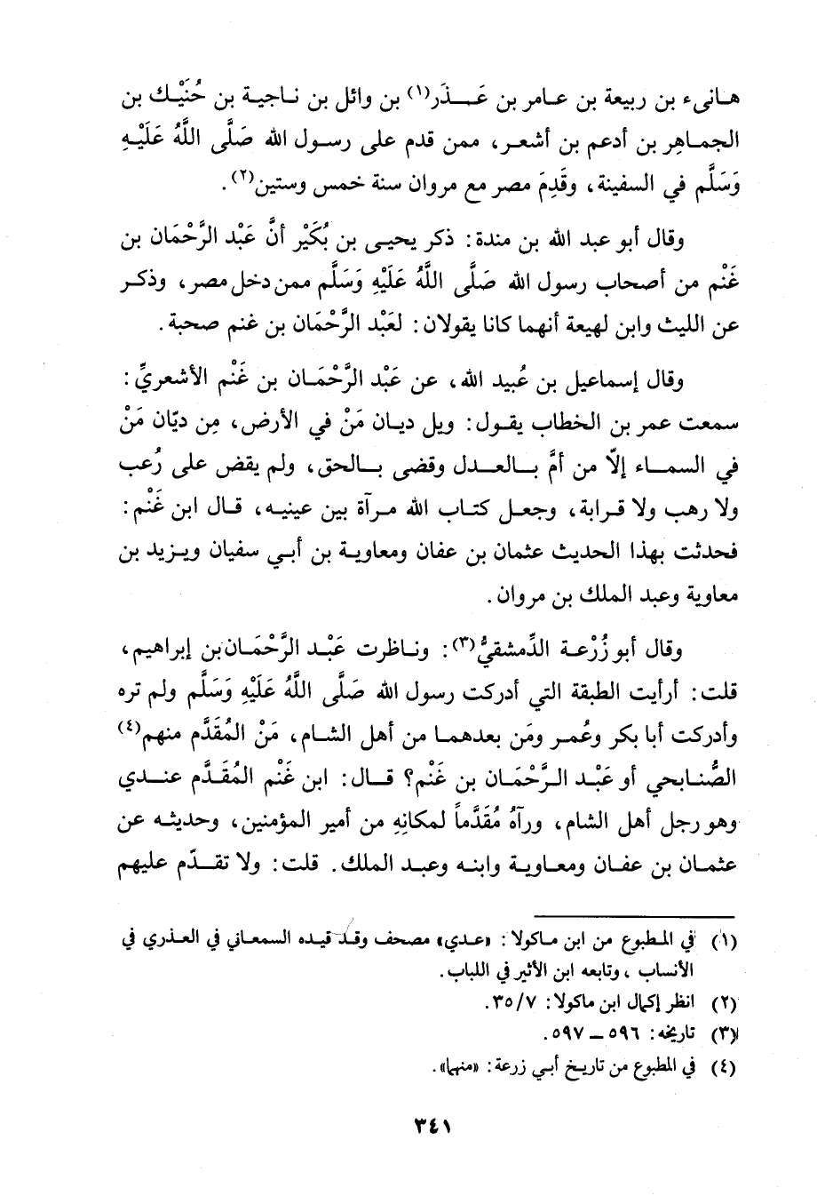 وَقَال أَبُو زُرْعَة الدمشقي (3) : وناظرت عَبْد الرَّحْمَن بْن إبراهيم، قلت: أرأيت الطبقة التي أدركت رَسُول اللَّهِ صَلَّى اللَّهُ عَلَيْهِ وسَلَّمَ ولم تره وأدركت أبا بَكْر وعُمَر ومن بعدهما من أهل الشام، من المقدم منهم (4) الصنابحي أو عَبْد الرَّحْمَن بْن غنم؟ قال: ابن غنم المقدم عندي وهو رجل أهل الشام، ورآه مقدما لمكانه من أمير المؤمنين، وحديثه عَنْ عثمان بْن عفان ومعاوية وابنه وعبد الملك. قلت: ولا تقدم عليهم