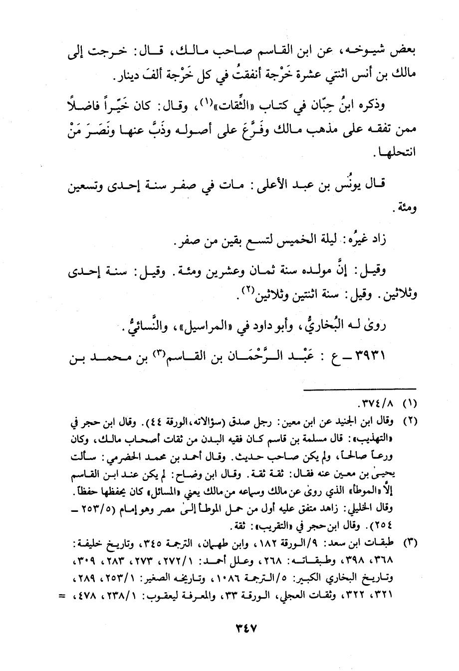 (2) وَقَال ابن الجنيد عن ابن مَعِين: رجل صدق (سؤالاته، الورقة 44) . وَقَال ابن حجر في "التهذيب": قال مسلمة بن قاسم كان فقيه البدن من ثقات أصحاب مالك، وكان ورعا صالحا، ولم يكن صاحب حديث. وَقَال أحمد بن محمد الحضرمي: سألت يَحْيَى بْن مَعِين عنه فقال: ثقة ثقة. وَقَال ابن وضاح: لم يكن عند ابن القاسم إلا"الموطأ"الذي روى عن مالك وسماعه من مالك يعني"المسائل"كان يحفظها حفظا. وَقَال الخليلي: زاهد متفق عليه أول من حمل الموطأ إلى مصر وهو إمام (5 / 253 - 254) . وَقَال ابن حجر في "التقريب": ثقة.