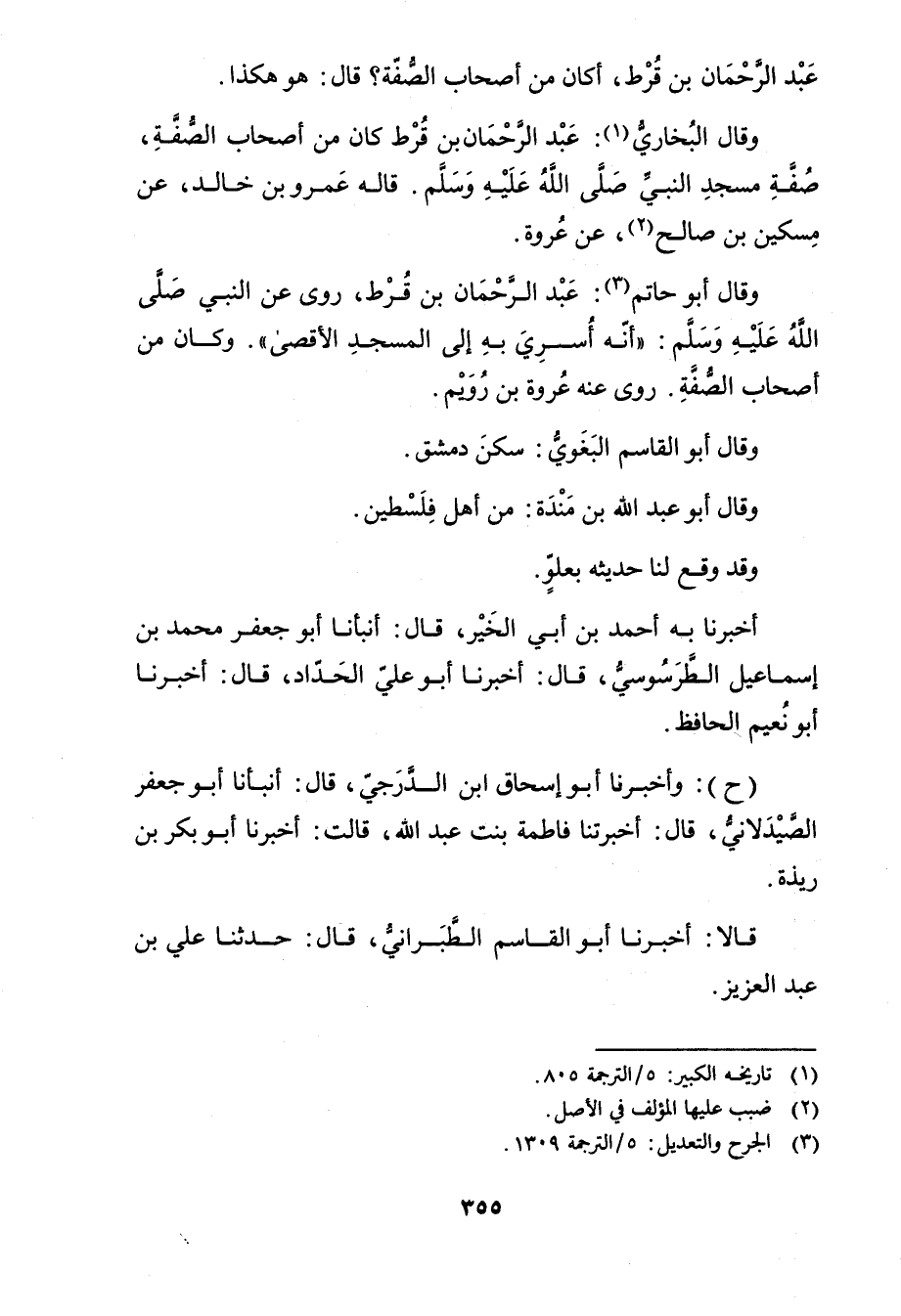 وَقَال أَبُو حاتم (3) : عَبْد الرَّحْمَن بن قرط، رَوى عنِ النَّبِي صلى الله عليه وسَلَّمَ: أنه أسري بِهِ إلى المسجد الأقصى". وكان من أصحاب الصفة. روى عنه عروة بْن رويم.