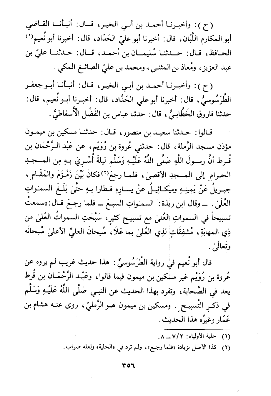 (ح) : وأَخْبَرَنَا أَحْمَدُ بْنُ أَبي الخير، قال: أَنْبَأَنَا أَبُو جَعْفَرٍ الطَّرْسُوسِيُّ، قال: أَخْبَرَنَا أَبُو عَلِيّ الحداد، قال: أَخْبَرَنَا أَبُو نُعَيْمٍ، قال: حَدَّثَنَا فَارُوقٌ الْخَطَّابِيُّ، قال: حَدَّثَنَا عَبَّاسُ بْنُ الْفَضْلِ الأَسْفَاطِيُّ. قَالُوا: حَدَّثَنَا سَعِيد بْنُ مَنْصُورٍ، قال: حَدَّثَنَا مِسْكِينُ بْنُ مَيْمُونٍ مُؤَذِّنُ مَسْجِدِ الرَّمْلَةِ، قال: حَدَّثَنِي عُرْوَةُ بْنُ رُوَيْمٍ، عَنْ عَبْدِ الرَّحْمَنِ بْنِ قُرْطٍ أَنَّ رَسُول اللَّهِ صلى الله عليه وسَلَّمَ لَيْلَةَ أُسْرِيَ بِهِ مِنَ الْمَسْجِدِ الْحَرَامِ إِلَى الْمَسْجِدِ الأَقْصَى، فَلَمَّا رَجَعَ (2) فَكَانَ بَيْنَ زَمْزَمَ والْمَقَامِ، جِبْرِيلُ عَنْ يَمِينِهِ ومِيكَائِيلُ عن يساره فطارا بِهِ حَتَّى بَلَغَ السَّمَوَاتِ الْعُلَى.