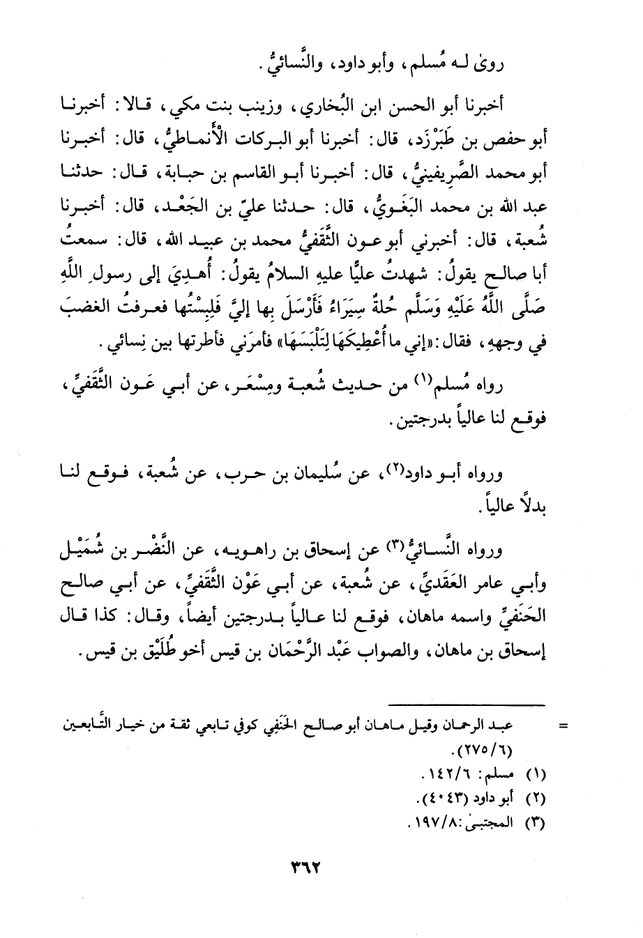 ورَوَاهُ النَّسَائي (3) عَنْ إِسْحَاقَ بْنِ رَاهَوَيْهِ، عَنِ النضر بْن شميل وأبي عامر العقدي، عَنْ شُعْبَة، عَن أَبِي عون الثقفي، عَن أَبِي صالح الحنفي واسمه ماهان، فوقع لَنَا عَالِيًا بِدَرَجَتَيْنِ أَيْضًا، وَقَال: كذا قال إسحاق بْن ماهان، والصواب عَبْد الرَّحْمَن بْن قيس أخو طليق بن قيس.