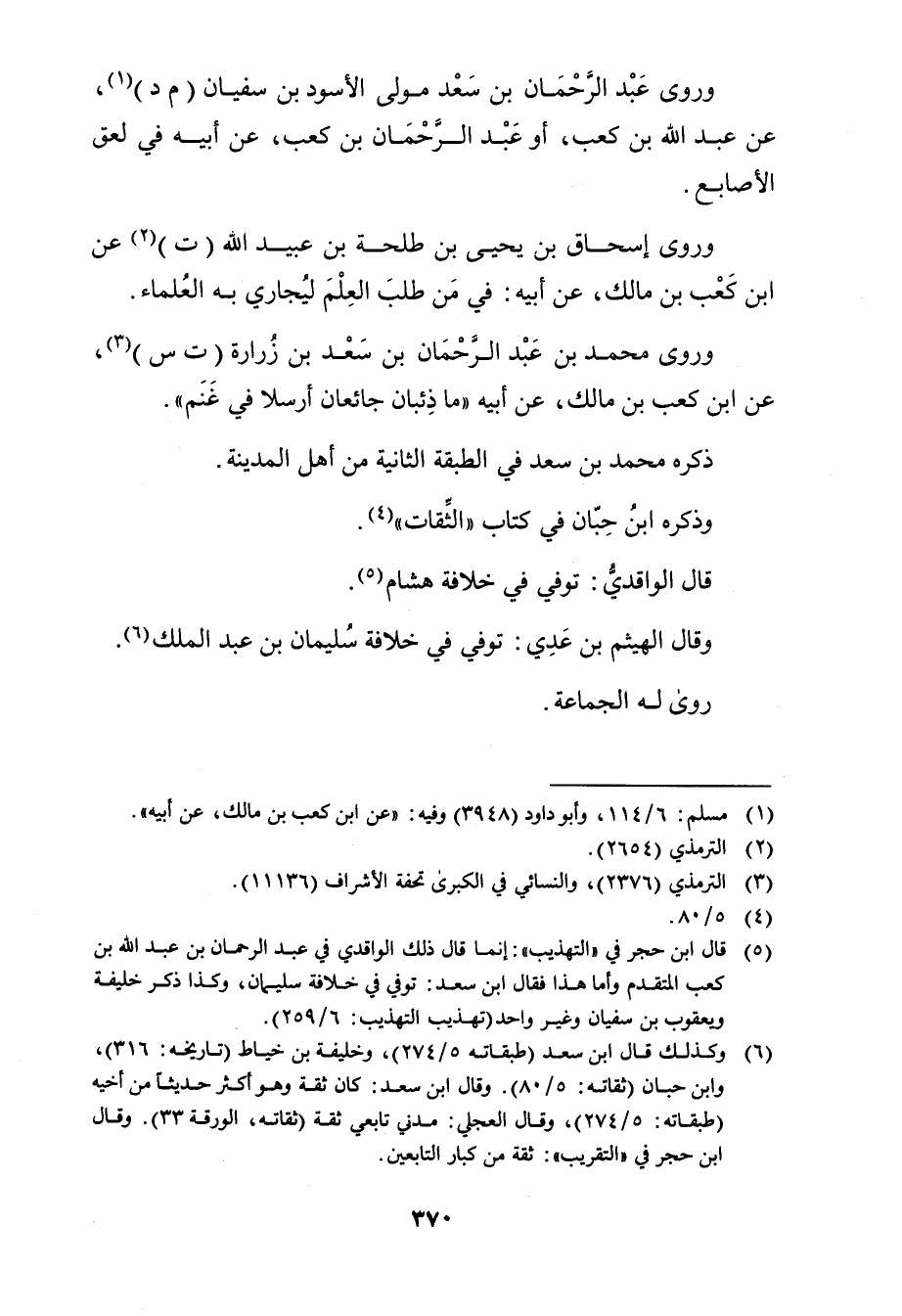 (5) قال ابن حجر في "التهذيب": إنما قال ذلك الواقدي في عَبْد الرَّحْمَنِ بْن عَبد اللَّهِ بن كعب المتقدم وأما هذا فقال ابن سعد: توفي فِي خلافة سُلَيْمان، وكذا ذكر خليفة ويعقوب بن سفيان وغير واحد (تهذيب التهذيب: 6 / 259) .