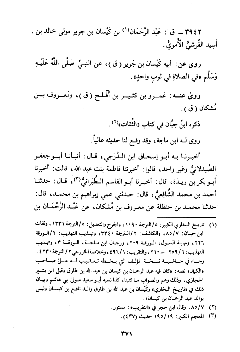 (1) تاريخ البخاري الكبير: 5 / الترجمة 1090، والجرح والتعديل: 5 / الترجمة 1331، وثقات ابن حبان: 7 / 85، والكاشف: 2 / الترجمة 3340، وتهذيب التهذيب: 2 / الورقة 226، ونهاية السول، الورقة 209، ورجال ابن ماجة، الورقة 3، وتهذيب التهذيب: 6 / 259 - 260، والتقريب: 1 / 496، وخلاصة الخزرجي 2 / الترجمة 4230. وجاء في حاشية نسخة المؤلف التي بخطه تعقيب له على صاحب "الكمال" نصه: كان فيه عَبْد الرَّحْمَن بن كيسان بن عَبد اللَّهِ بْن طَارِق وقيل ابن بشير الحجازي، وذلك وهم والصواب ما كتبنا، كذا نسبه أَبُو سَعِيد مَوْلَى بَنِي هَاشِمٍ وبيان
