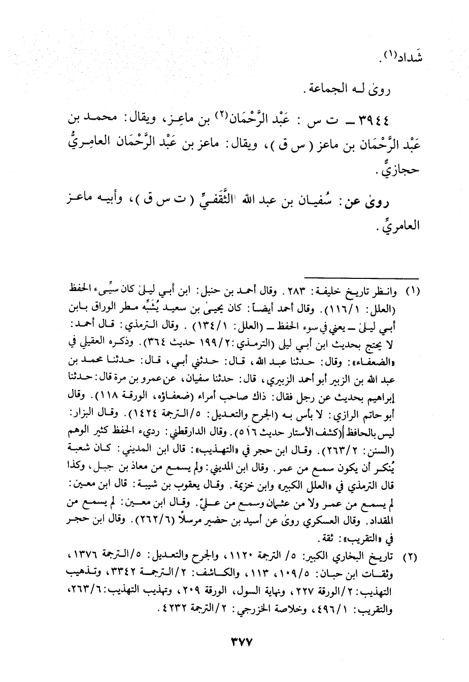 3944 - ت س: عَبْد الرَّحْمَن بن ماعز (2) ، ويُقال: مُحَمَّد بْن عَبْد الرَّحْمَنِ بْن ماعز (س ق) ، ويُقال: ماعز بْن عَبْد الرَّحْمَن العامري حجازي.