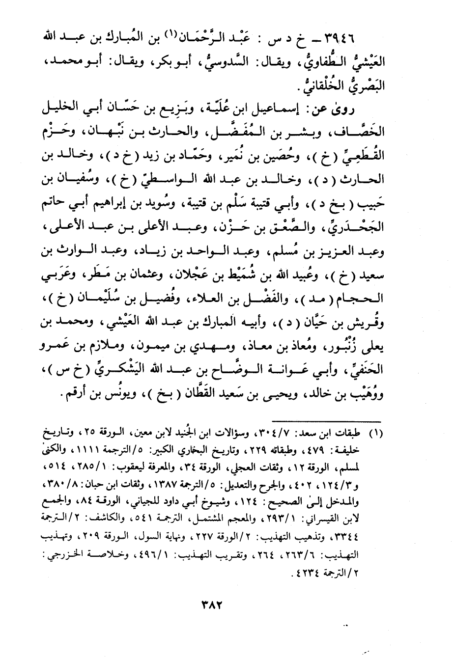 3946 - خ د س: عَبْد الرَّحْمَن بن المبارك بن عَبد اللَّه العيشي الطفاوي (1) ، ويُقال: السدوسي، أَبُو بَكْر، ويُقال: أَبُو مُحَمَّد، البَصْرِيّ الخلقاني.
