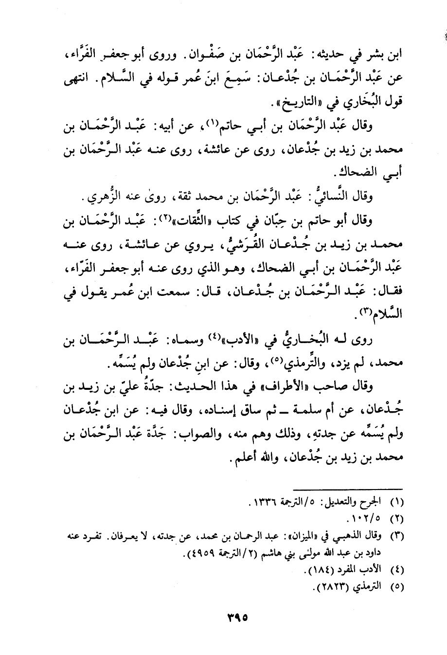 وَقَال أَبُو حَاتِم بْن حبان فِي كتاب "الثقات" (2) : عَبْد الرَّحْمَنِ بْن مُحَمَّد بْن زيد بْن جدعان القرشي، يروي عَنْ عائشة، روى عنه عَبْد الرَّحْمَنِ بْن أَبي الضحاك، وهو الذي روى عنه أَبُو جَعْفَر الفراء، فقال: عَبْد الرَّحْمَن بْن جدعان، قال: سَمِعْتُ ابن عُمَر يقول فِي السلام (3) .