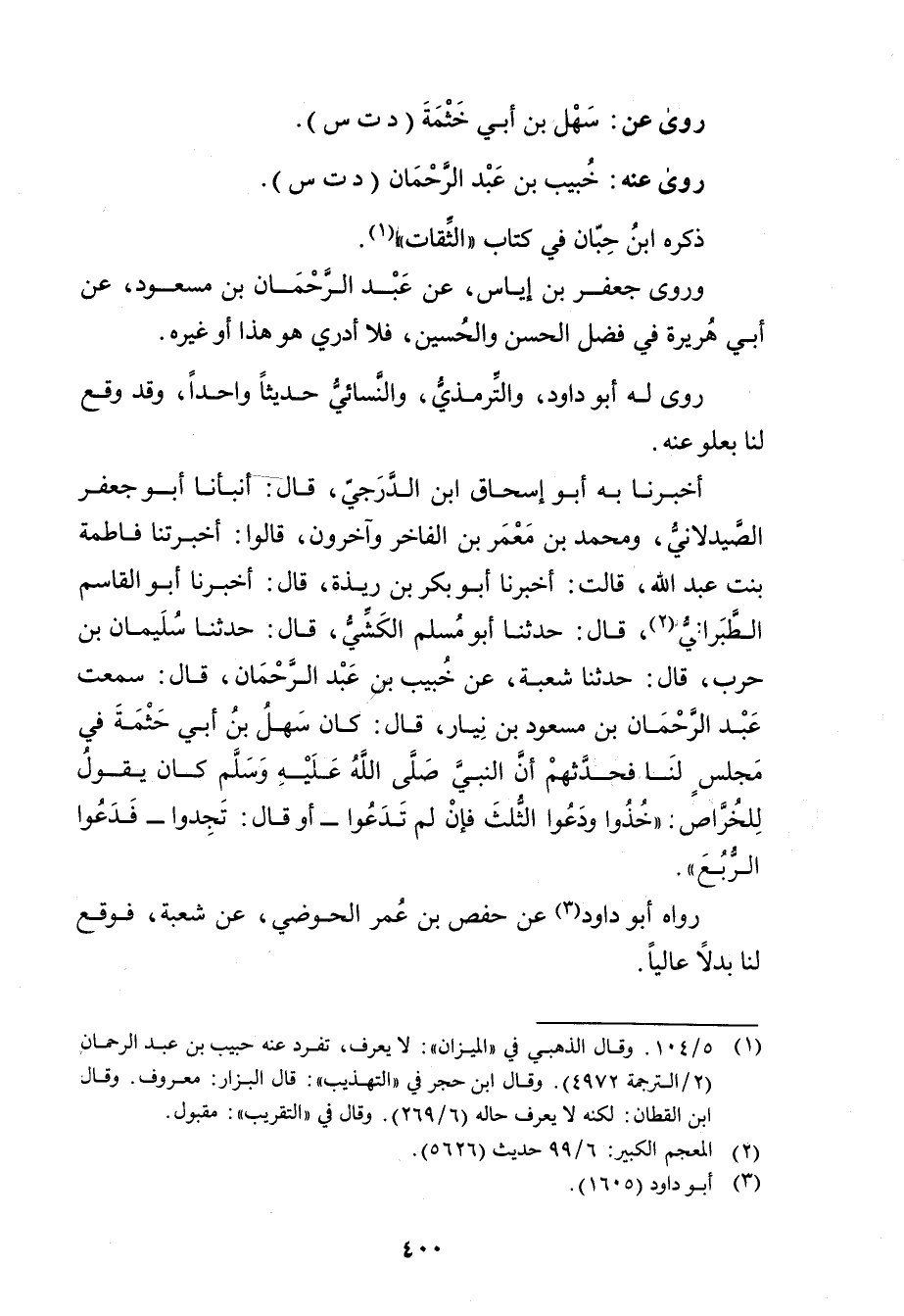 أَخْبَرَنَا بِهِ أَبُو إِسْحَاقَ ابْنُ الدَّرَجِيِّ، قال: أَنْبَأَنَا أَبُو جَعْفَرٍ الصَّيْدَلانِيُّ، ومُحَمَّدُ بْنُ مَعْمَرِ بْنِ الْفَاخِرِ وآخَرُونَ، قَالُوا: أَخْبَرَتْنا فَاطِمَةُ بِنْتُ عَبد اللَّهِ، قَالَتْ: أخبرنا أَبُو بَكْرِ بْنِ رِيذَةَ، قال: أخبرنا أَبُو الْقَاسِمِ الطَّبَرَانِيُّ (2) ، قال: حَدَّثَنَا أَبُو مُسْلِمٍ الْكَشِّيُّ، قال: حَدَّثَنَا سُلَيْمان بْنُ حَرْبٍ، قال: حَدَّثَنَا شُعْبَةُ، عَنْ خَبِيبِ بْنِ عَبْدِ الرَّحْمَنِ، قال: سمعت عَبْد الرحمن بْن مَسْعُودِ بْنِ نِيَارٍ، قال: كَانَ سَهْلُ بْنُ أَبي حَثْمَةَ فِي مَجْلِسٍ لَنَا فَحَدَّثَهُمْ أَنَّ النَّبِيَّ صلى الله عليه وسلم كَانَ يَقُولُ لِلْخُرَّاصِ: خُذُوا ودَعُوا الثُّلُثَ فَإِنْ لَمْ تَدَعُوا - أَوْ قال: تَجِدُوا - فَدَعُوا الرُّبُعَ.