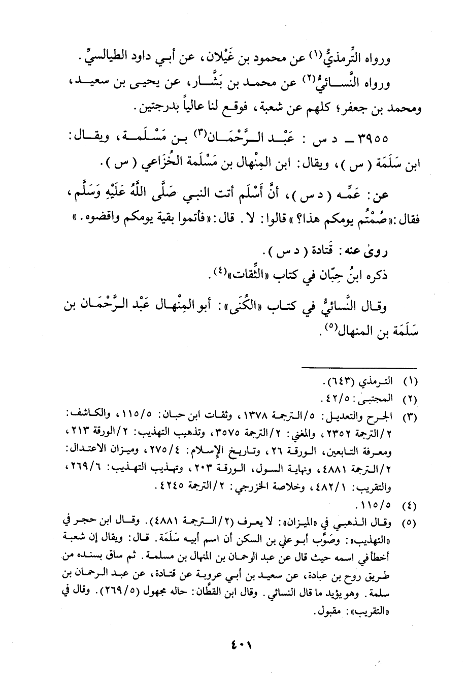(5) وَقَال الذهبي في "الميزان": لا يعرف (2 / الترجمة 4881) . وَقَال ابن حجر في "التهذيب": وصوب أبو علي بن السكن أن اسم ابيه سلمة. قال: ويُقال إن شعبة أخطأ في اسمه حيث قال عن عبد الرحمن بن المنهال بن مسلمة. ثم ساق بسنده من طريق روح بن عبادة، عن سَعِيد بن أَبي عَرُوبَة عن قتادة، عن عبد الرحمن بن سلمة. وهو يؤيد ما قال النَّسَائي.
