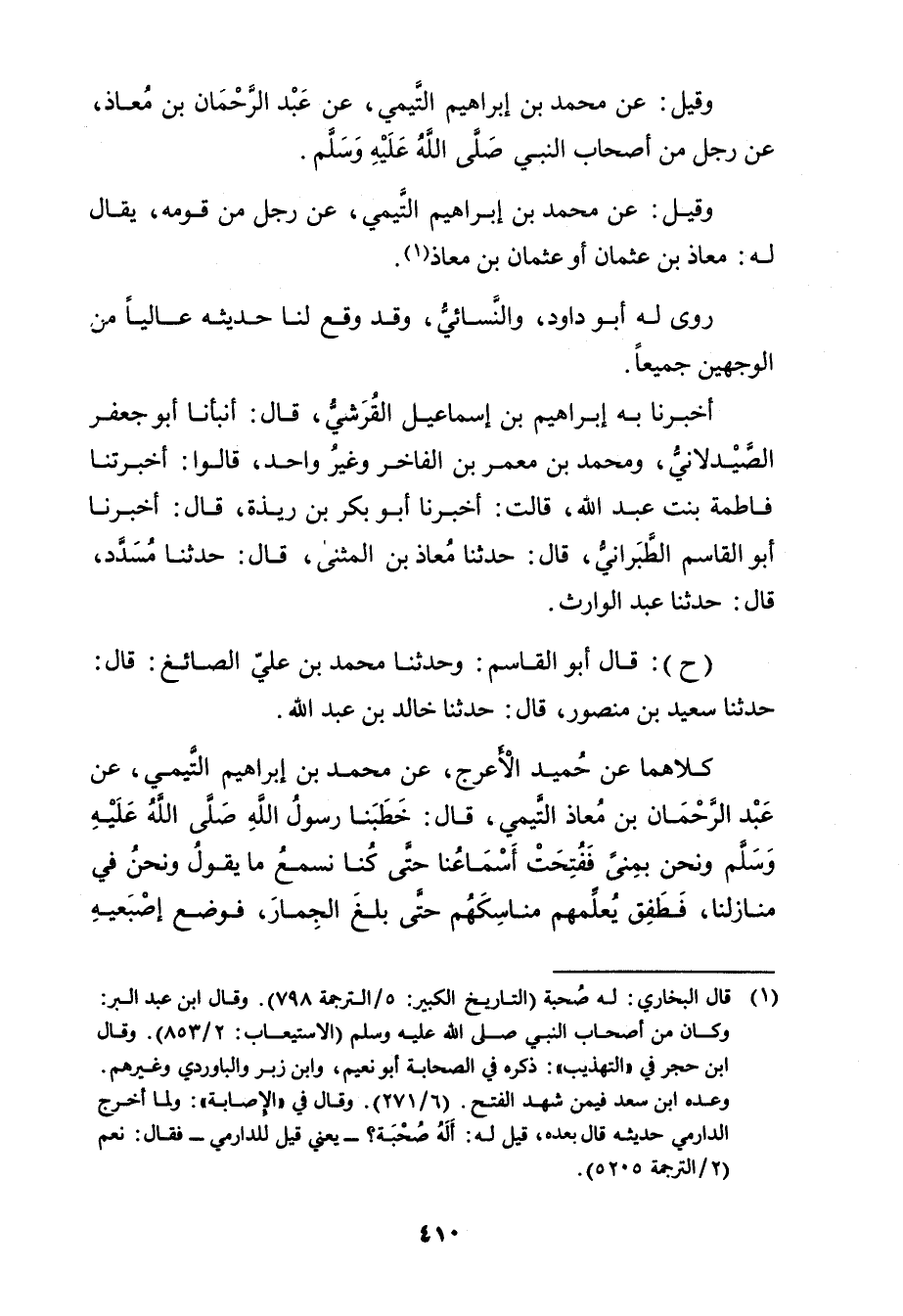 وقيل: عَنْ مُحَمَّد بْن إبراهيم التَّيْمِيّ، عَنْ رجل من قومه، يقال له: معاذ بْن عثمان أو عثمان بْن معاذ (1) .
