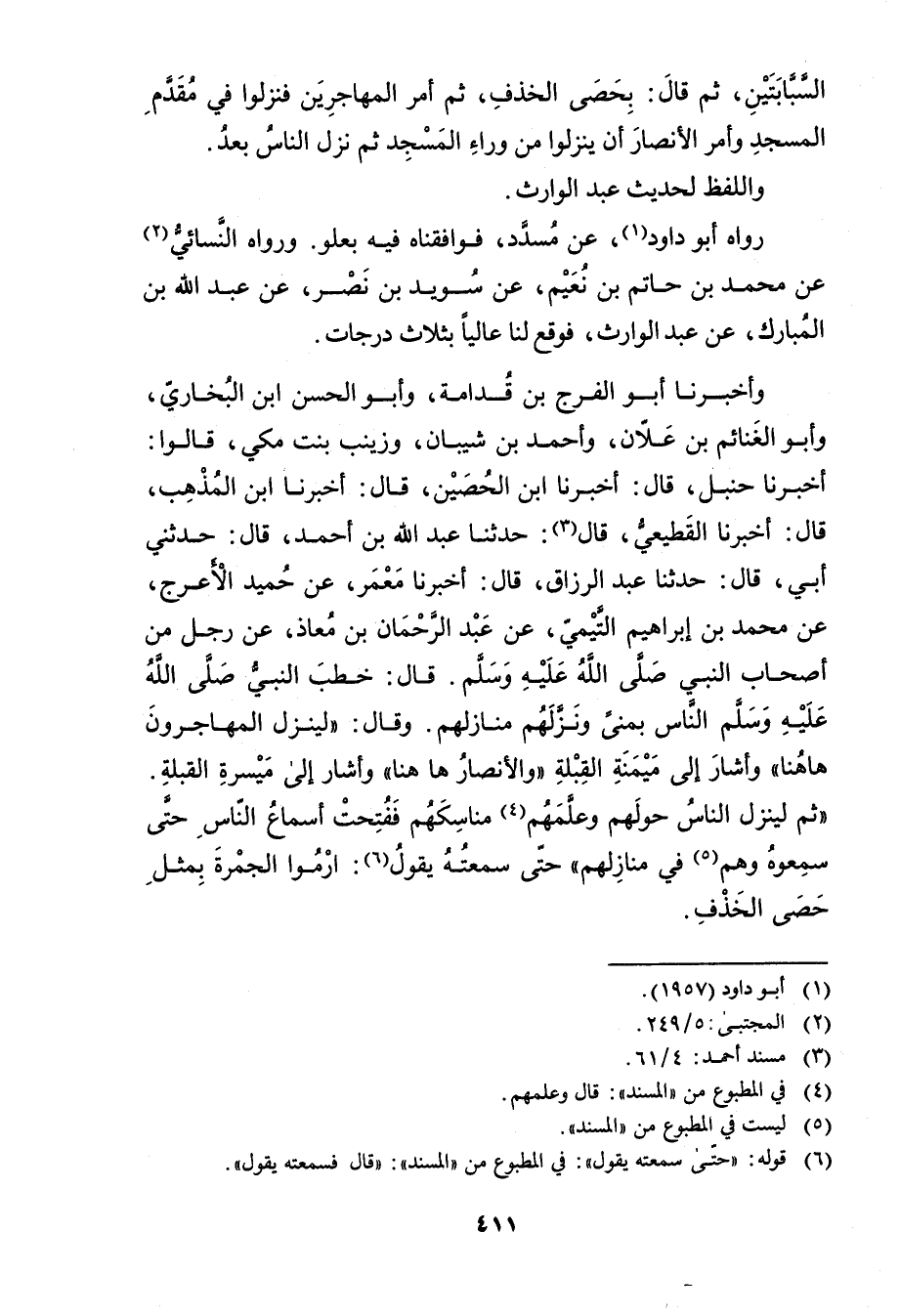 قال: خَطَبَ النَّبِيُّ صَلَّى اللَّهُ عَلَيْهِ وسَلَّمَ النَّاسَ بِمِنَى ونَزَلَّهُمْ مَنَازِلَهُمْ. وَقَال: لِيَنْزِلِ الْمُهَاجِرُونَ هَاهُنَا"وأَشَارَ إِلَى مَيْمَنَةِ الْقِبْلَةِ"والأنصار ها هنا"وأَشَارَ إِلَى مَيْسَرَةِ الْقِبْلَةِ. "ثُمَّ لِيَنْزِلَ النَّاسُ حَوْلَهُمْ وعَلَّمَهُمْ (4) مَنَاسِكَهُمْ فَفُتِحَتْ أَسْمَاعُ النَّاسِ حَتَّى سَمِعُوهُ وهم (5) فِي مَنَازِلِهِمْ"حَتَّى سَمِعْتُهُ يَقُولُ (6) : ارْمُوا الْجَمْرَةَ بِمِثْلِ حَصَى الخذف.