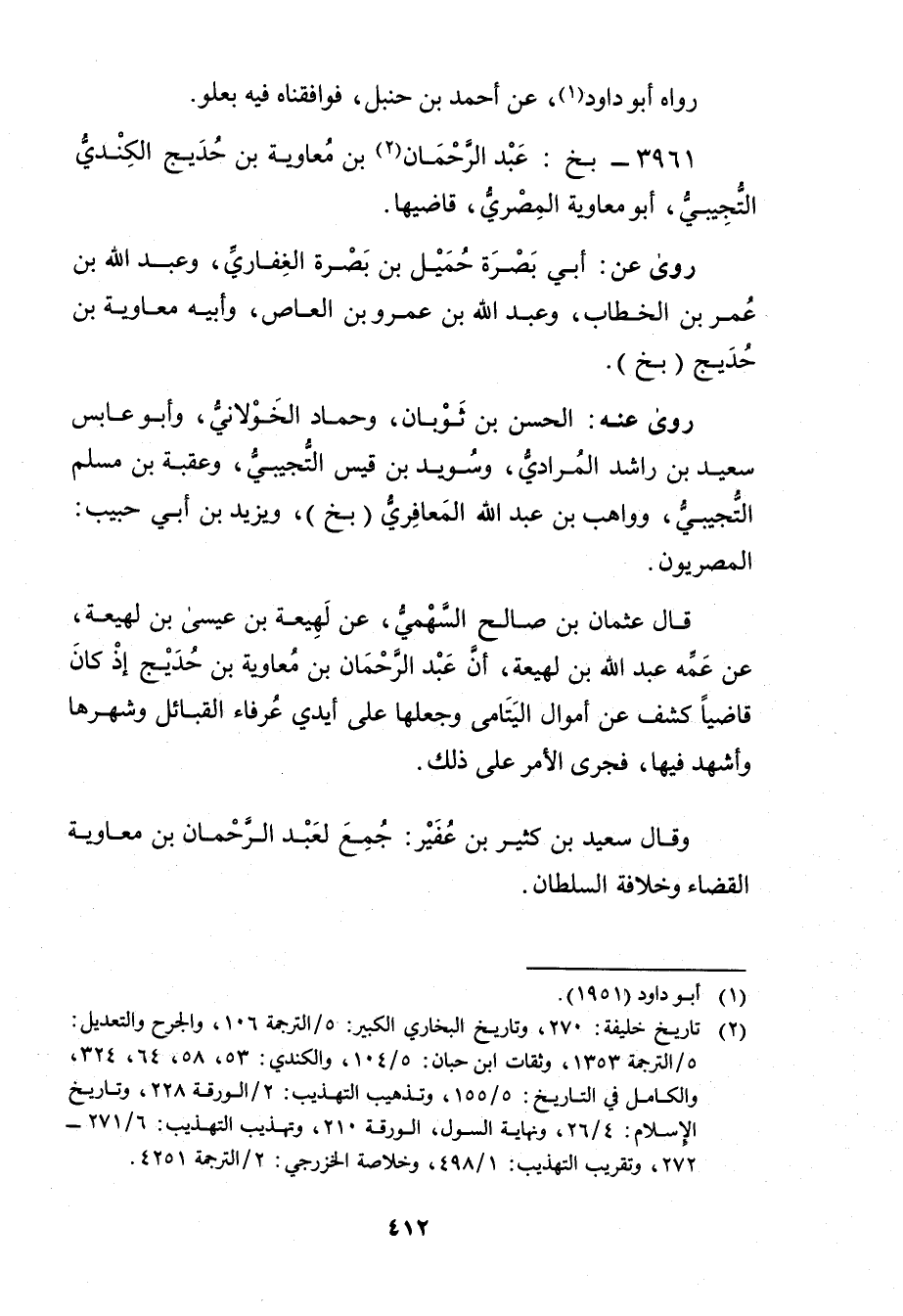 3961 - بخ: عَبْد الرَّحْمَن بن معاوية بن حديج الكندي التجيبي (2) ، أَبُو معاوية المِصْرِي، قاضيها.