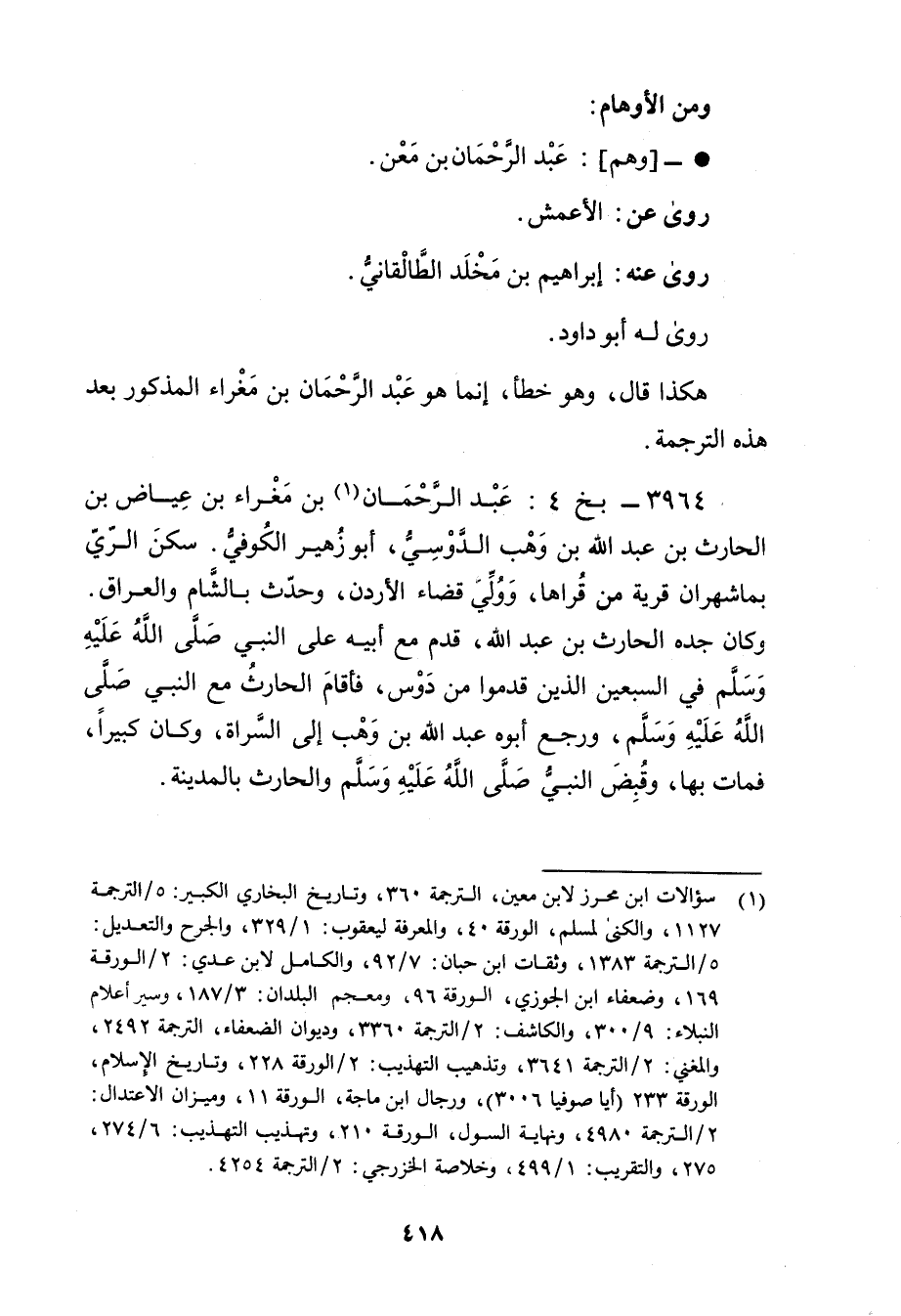 3964 - بخ 4: عَبْد الرَّحْمَن بن مغراء بن عياض بن الحارث بن عَبد اللَّه بن وهب الدوسي (1) ، أَبُو زهير الكوفي. سكن الري بماشهران قرية من قراها، وولي قضاء الأردن، وحدث بالشام والعراق. وكان جده الحارث بْن عَبد اللَّه، قدم مع أبيه على النبي صلى الله عليه وسلم فِي السبعين الذين قدموا من دوس، فأقام الحارث مع النبي صَلَّى اللَّهُ عَلَيْهِ وسَلَّمَ، ورجع أبوه عَبد اللَّه بْن وهب إلى السراة، وكان كبيرا، فمات بها، وقبض النبي صَلَّى اللَّهُ عَلَيْهِ وسلم والحارث بالمدينة.