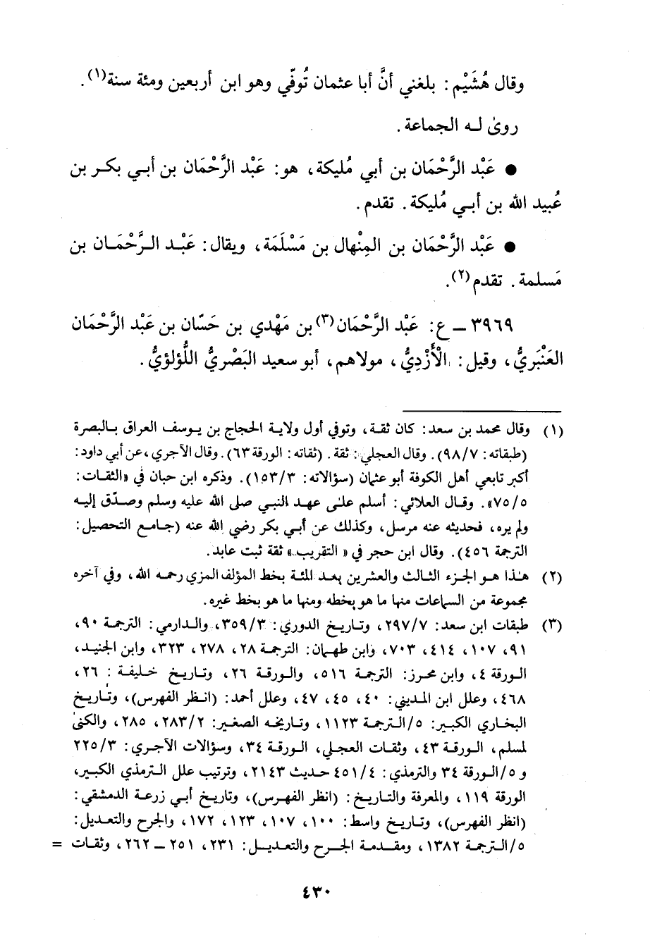 3969 - ع: عَبْد الرَّحْمَن بن مهدي بن حسان بن عَبْد الرحمن العنبري (3) ، وقيل: الأزدي، مولاهم، أَبُو سَعِيد البَصْرِيّ اللؤلؤي.
