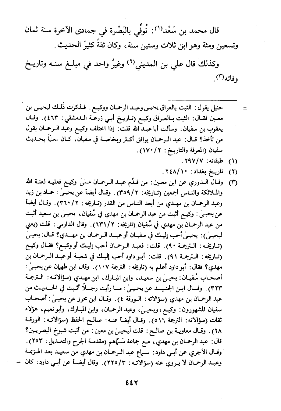 (3) وَقَال الدوري عن ابن مَعِين: من قدم عبد الرحمن على وكيع فعليه لعنة الله والملائكة والناس أجمعين (تاريخه: 2 / 359) . وَقَال أيضا عن يحيى: حماد بن زيد وعبد الرحمن بن مهدي من أبعد الناس من القدر (تاريخه: 2 / 360) . وَقَال أيضا عن يحيى: وكيع أثبت من عبد الرحمن بن مهدي في سفيان، يحيى بن سَعِيد أثبت من عبد الرحمن بن مهدي في سفيان (تاريخه: 2 / 631) . وَقَال الدارمي: قلت (يعني ليحيى) : يحيى أحب إليك في سفيان أو عبد الرحمن بن مهدي؟ قال: يحيى (تاريخه: الترجمة 90) . قلت: فعبد الرحمن أحب إليك أو وكيع؟ فقال وكيع (تاريخه: الترجمة 91) . قلت: أبو داود أحب إليك في شعبة أو عبد الرحمن بن مهدي؟ فقال: أبو داود أعلم به (تاريخه: الترجمة 107) . وَقَال ابن طهمان عن يحيى: أصحاب سفيان: يحيى بن سَعِيد، وابن المبارك، ابن مهدي (سؤالاته: الترجمة 323) .