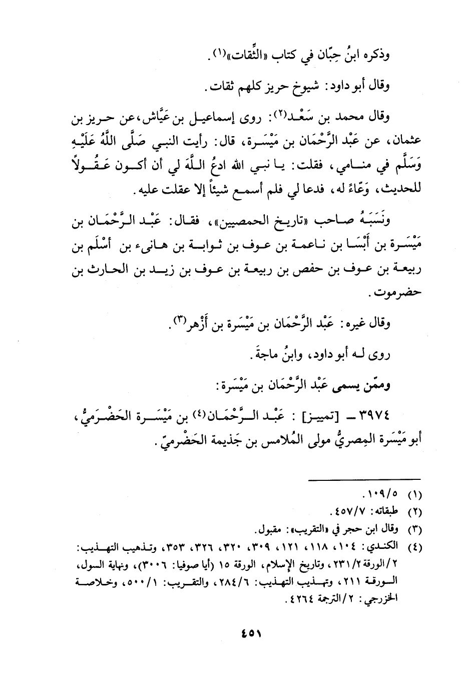 3974 - تمييز: عَبْد الرَّحْمَن بن ميسرة الحضرمي (4) ، أَبُو ميسرة المِصْرِي مولى الملامس بْن جذيمة الحضرمي.